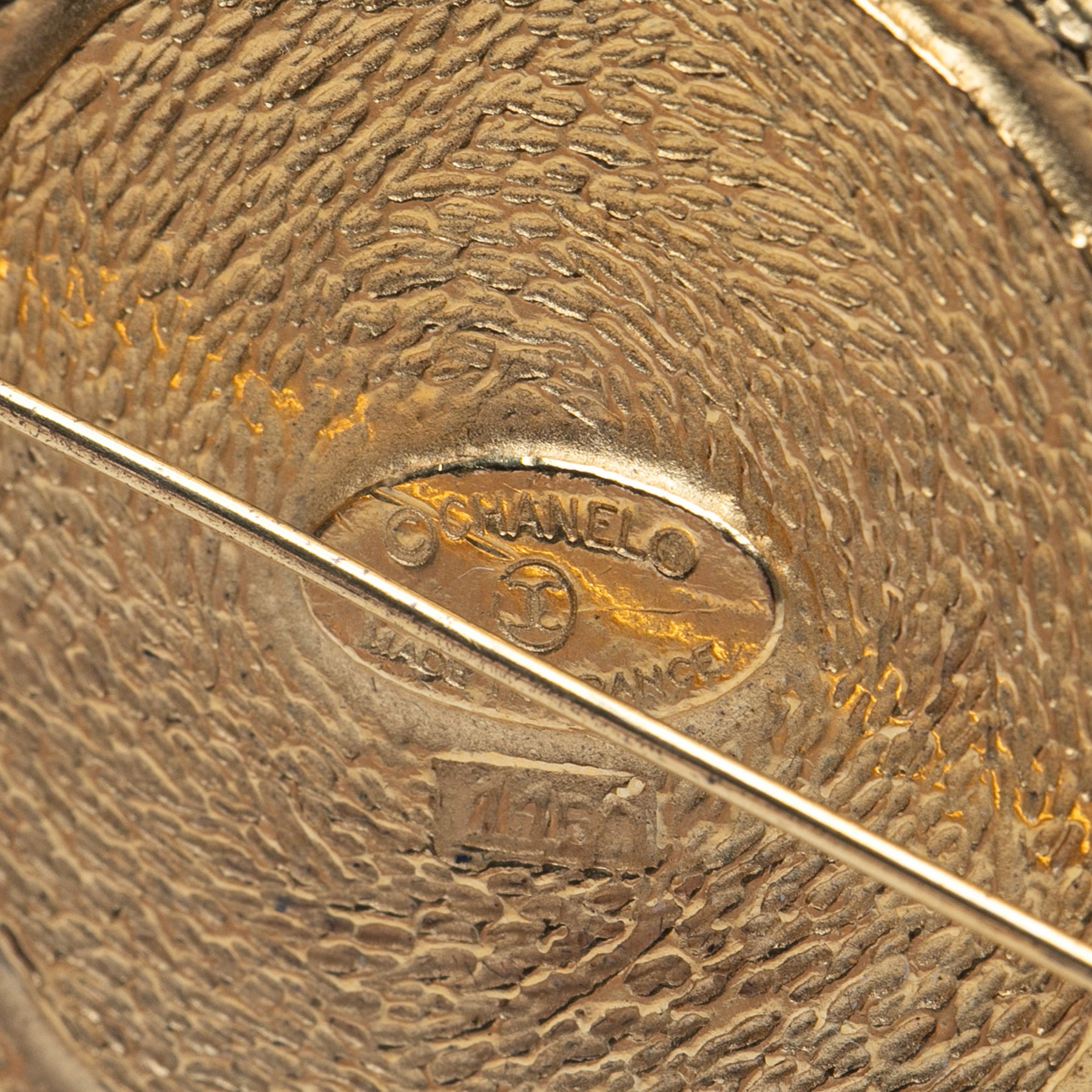 Cette broche est en métal plaqué or et se ferme par une épingle au dos. Elle est en bon état.