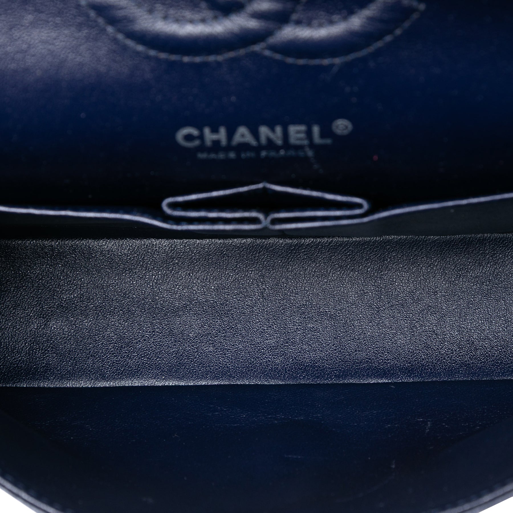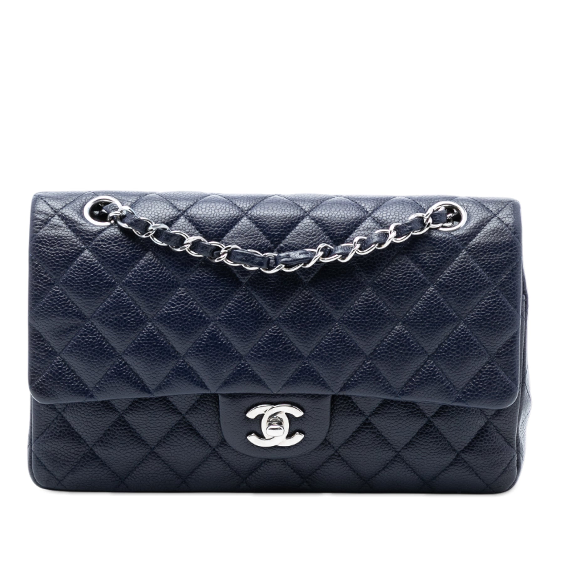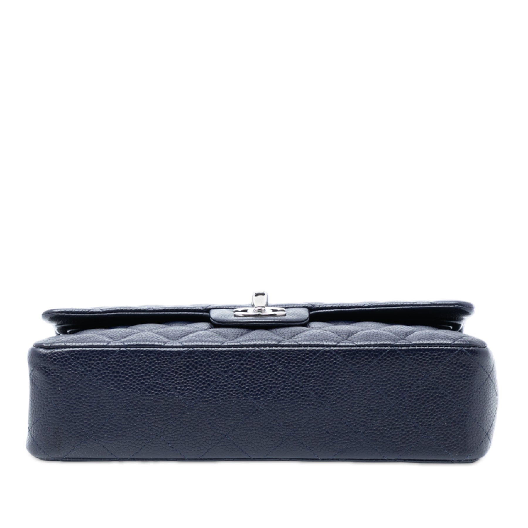 Ce sac bandoulière est confectionné en cuir caviar matelassé et possède une bandoulière en chaîne tressée, un double rabat avant avec fermoir CC, une poche plaquée extérieure au dos, ainsi que des poches intérieures zippées et plaquées. Il est en excellent état.