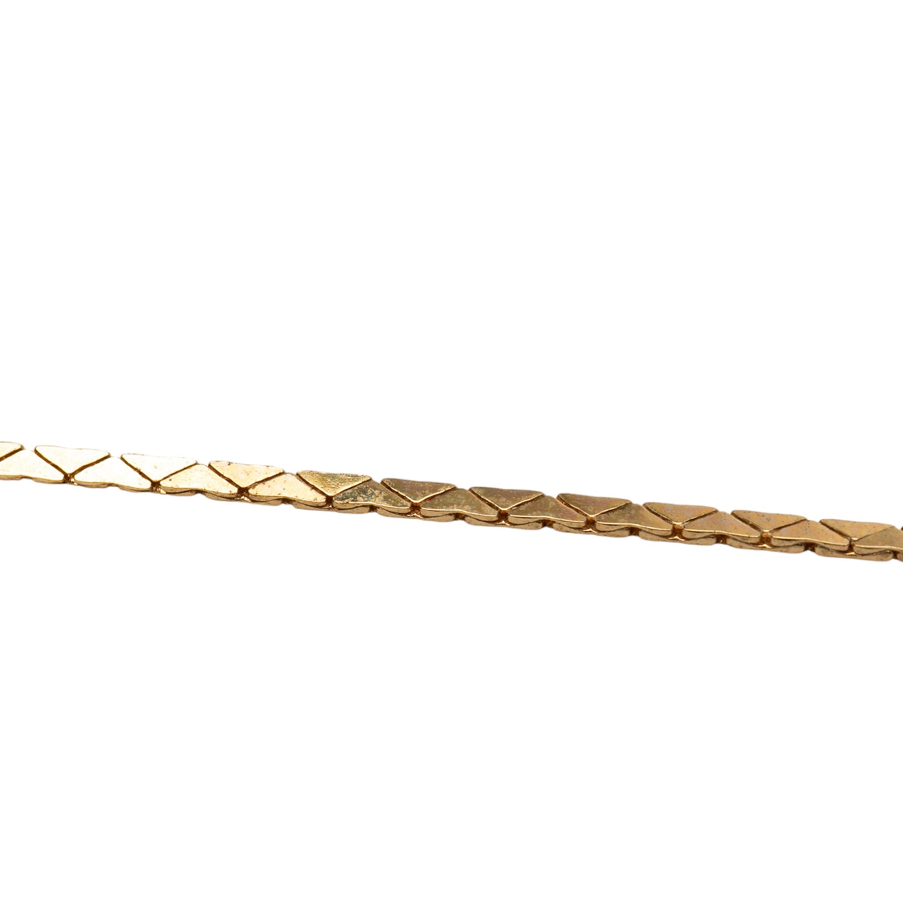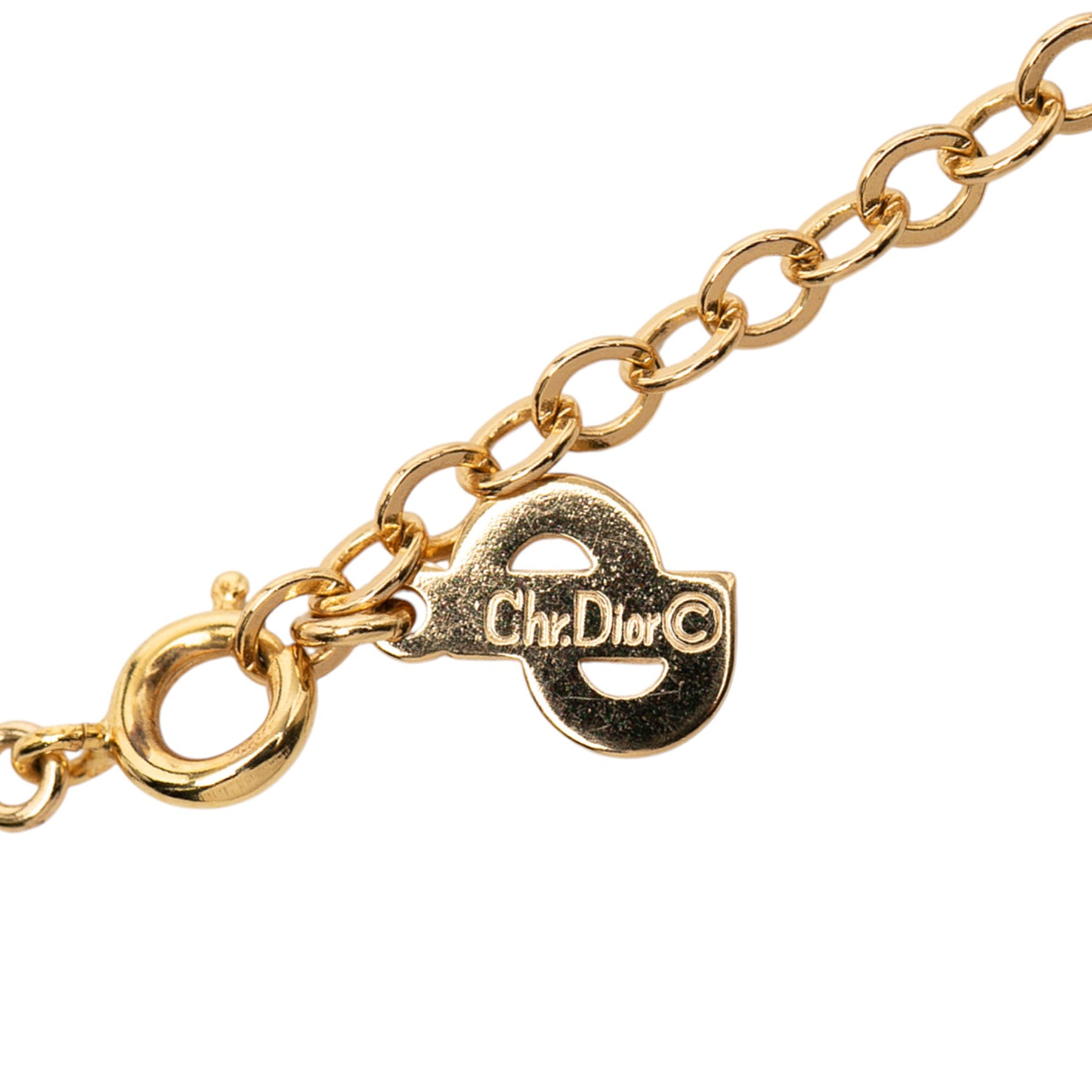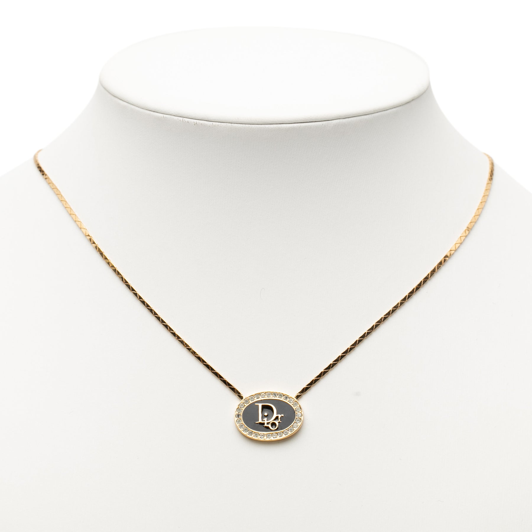 Ce collier est composé d'un corps doré orné d'une chaîne serpent, d'un pendentif logo rehaussé de strass et d'un fermoir à ressort. Il est en bon état.