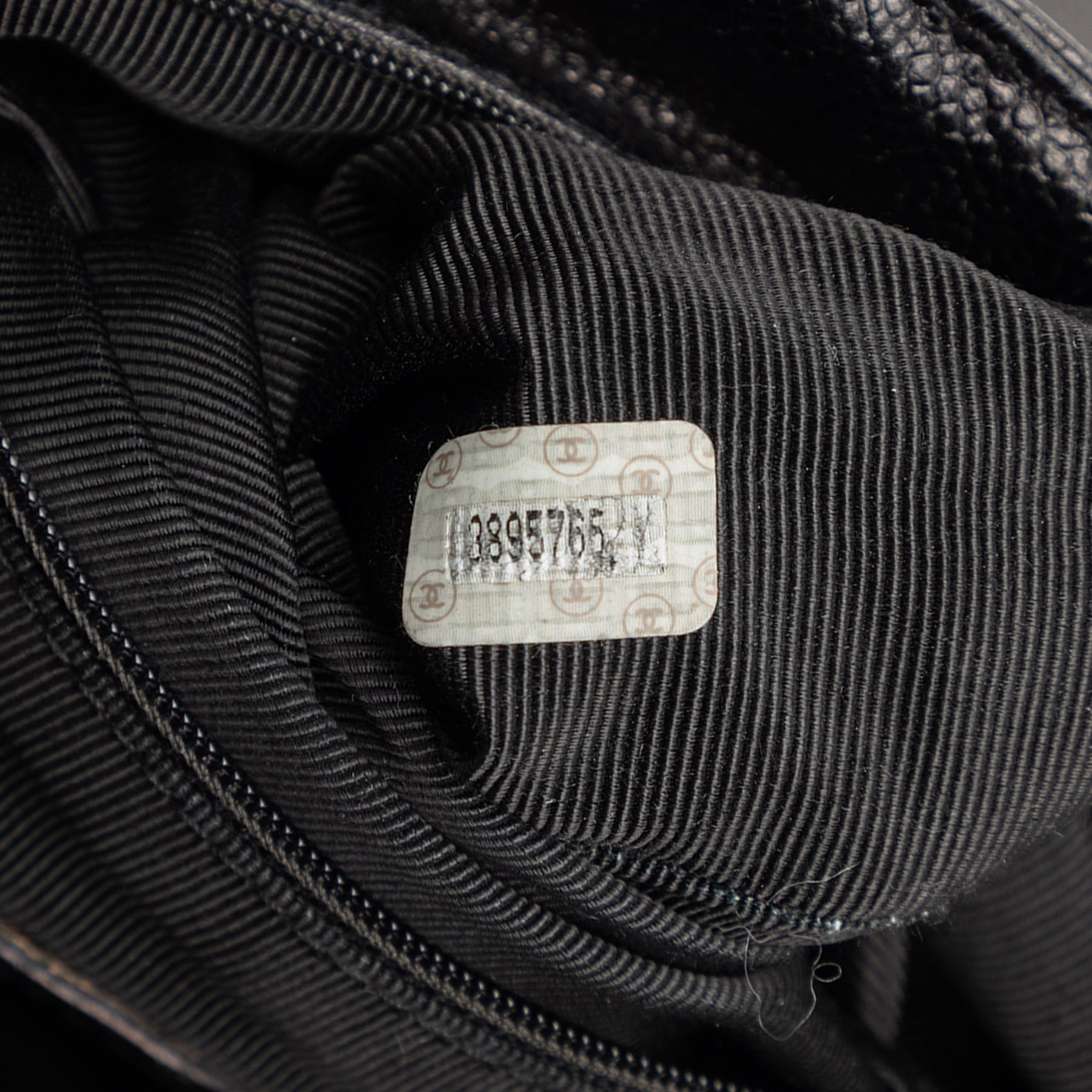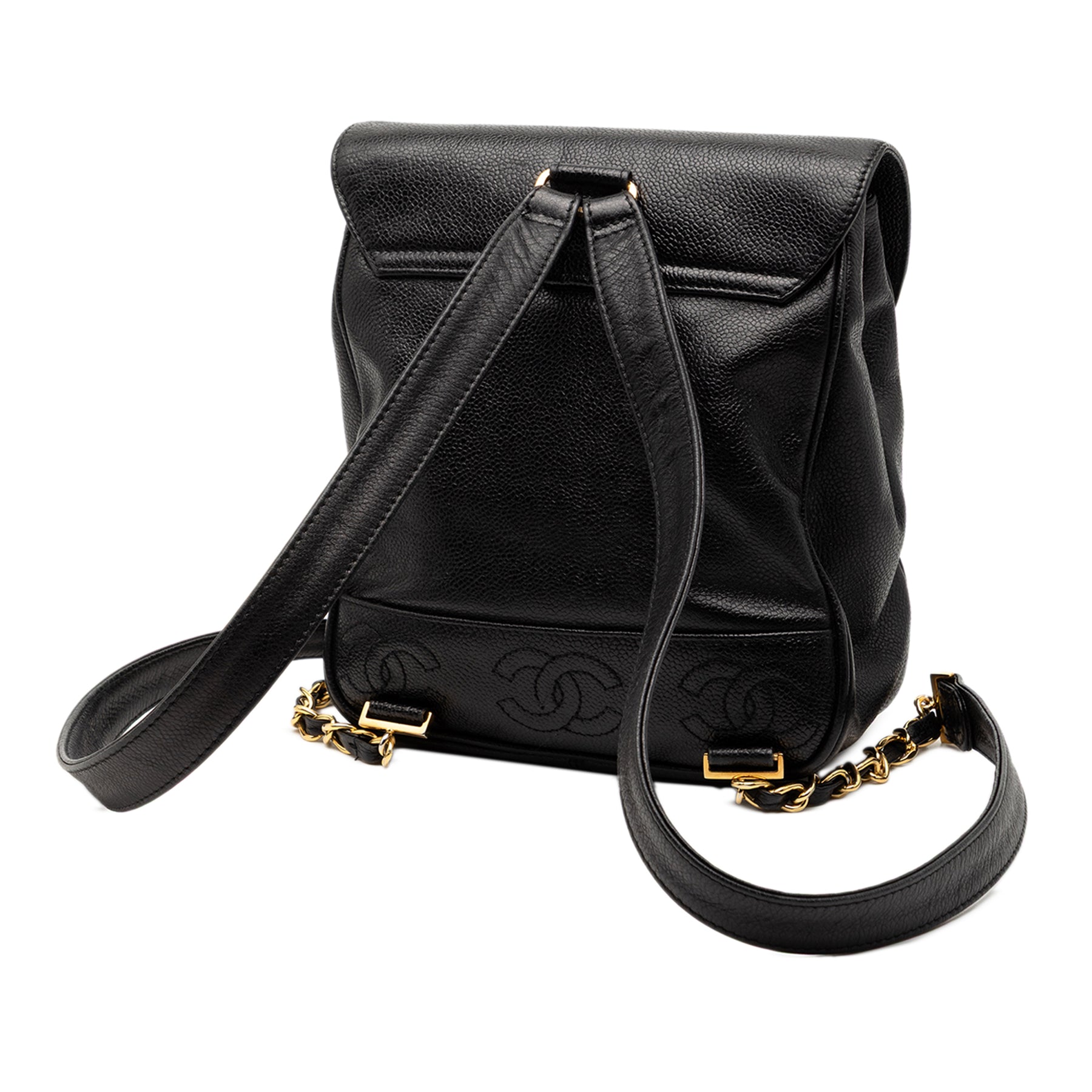 Ce sac à dos est en cuir caviar, avec des bretelles plates en cuir, un rabat supérieur orné de deux C entrelacés dorés et d'une fermeture à tourniquet, ainsi que des poches intérieures zippées. Il est en bon état.