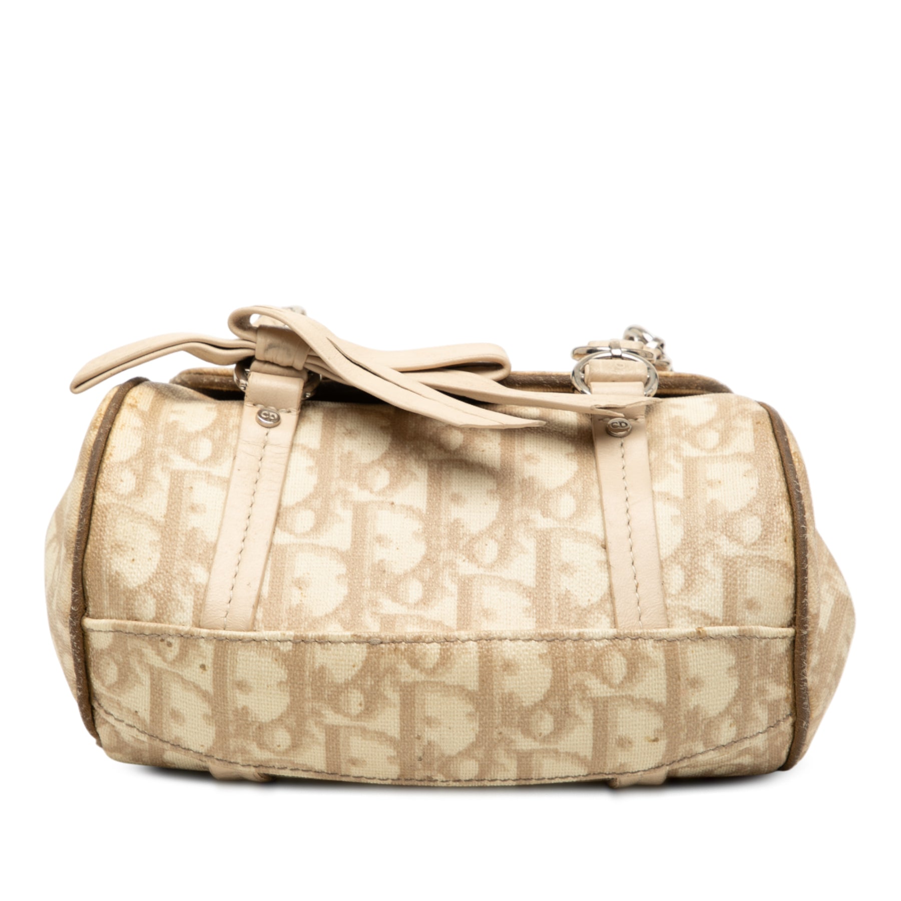 Ce sac à main est en toile enduite ornée d'un ruban, possède des anses en cuir avec des détails en chaînette, un rabat avant à fermeture magnétique et une poche intérieure zippée. Il est en bon état.