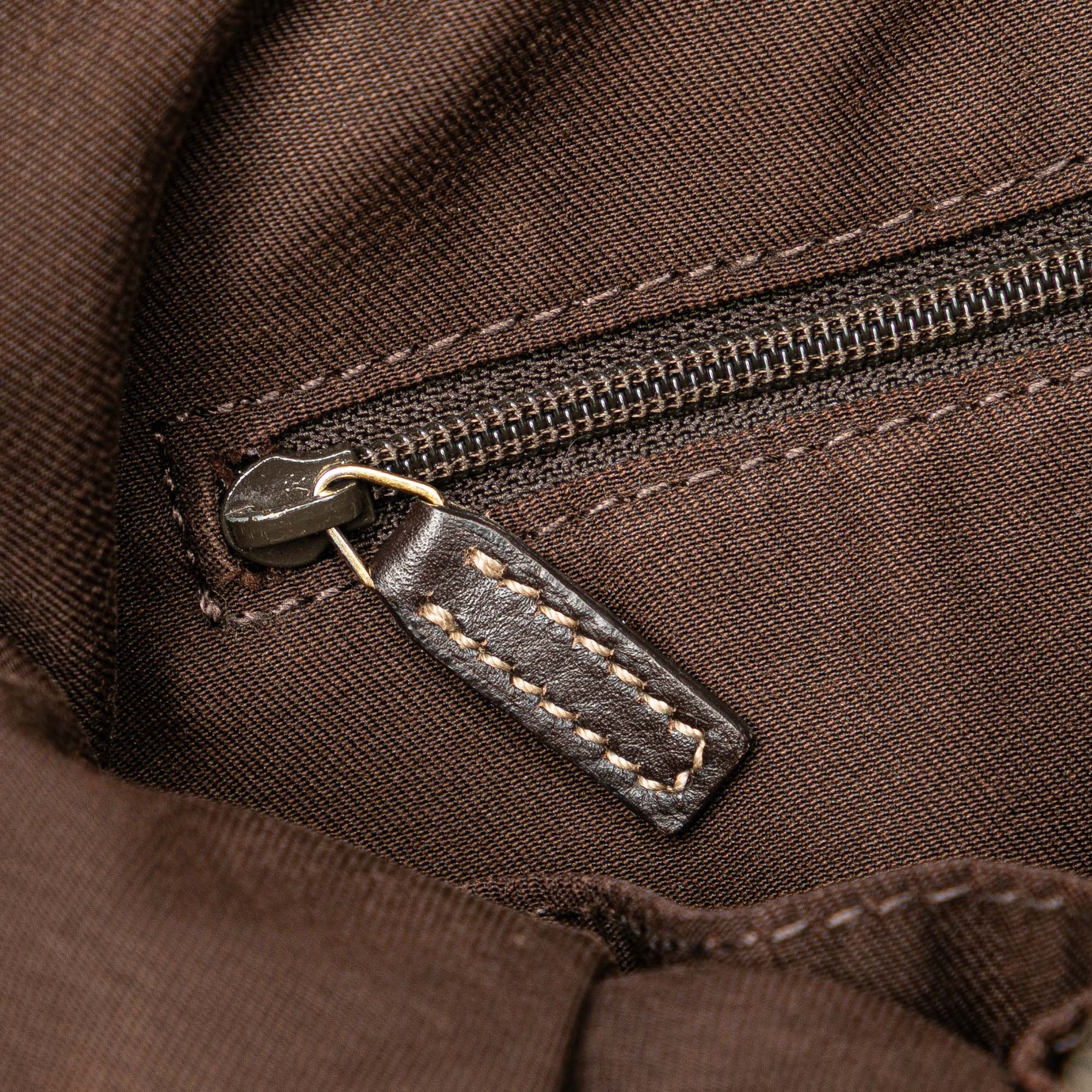 Ce sac bandoulière est en toile avec des finitions en cuir, une bandoulière plate réglable en cuir, une fermeture zippée sur le dessus et des poches intérieures zippées et plaquées. Il est en bon état.