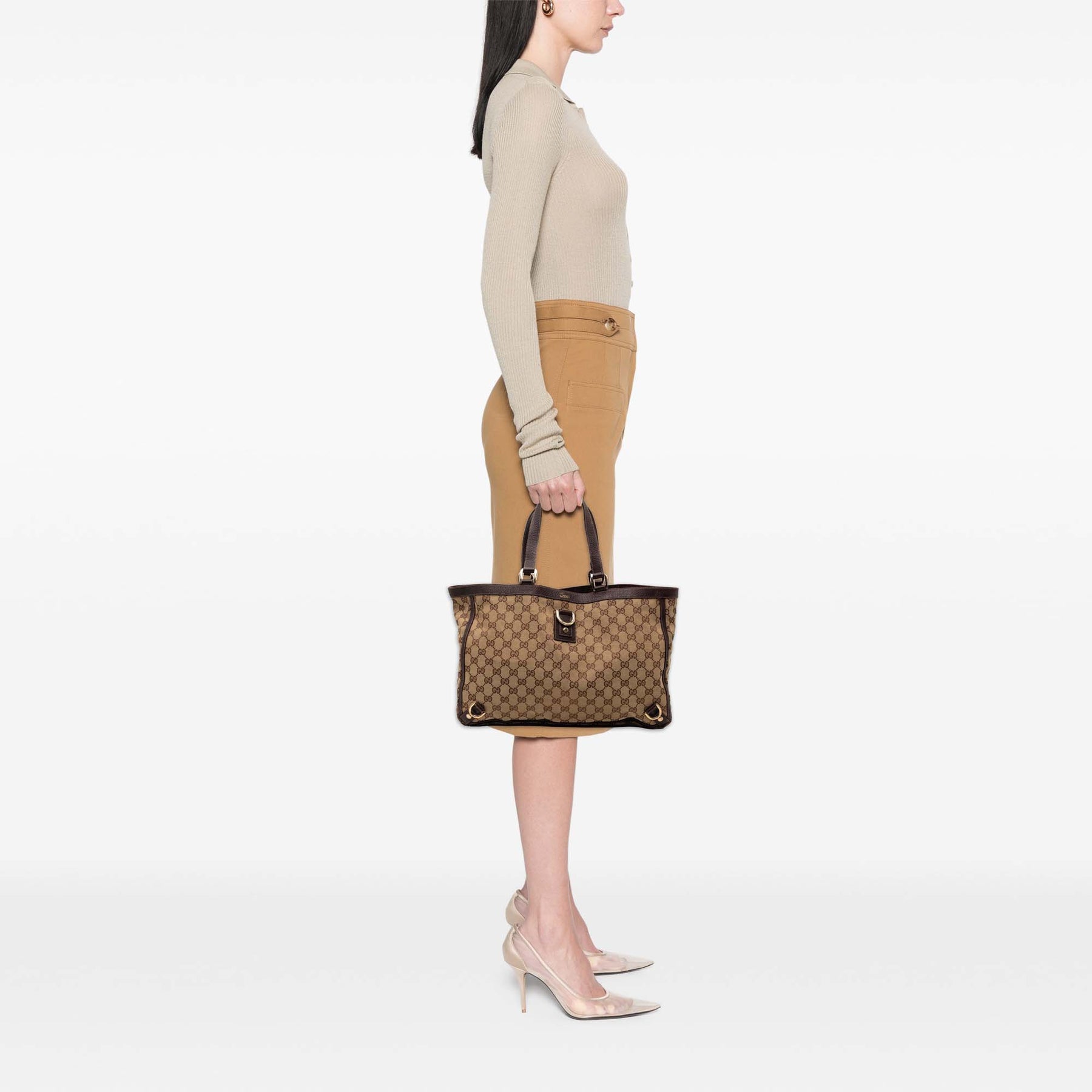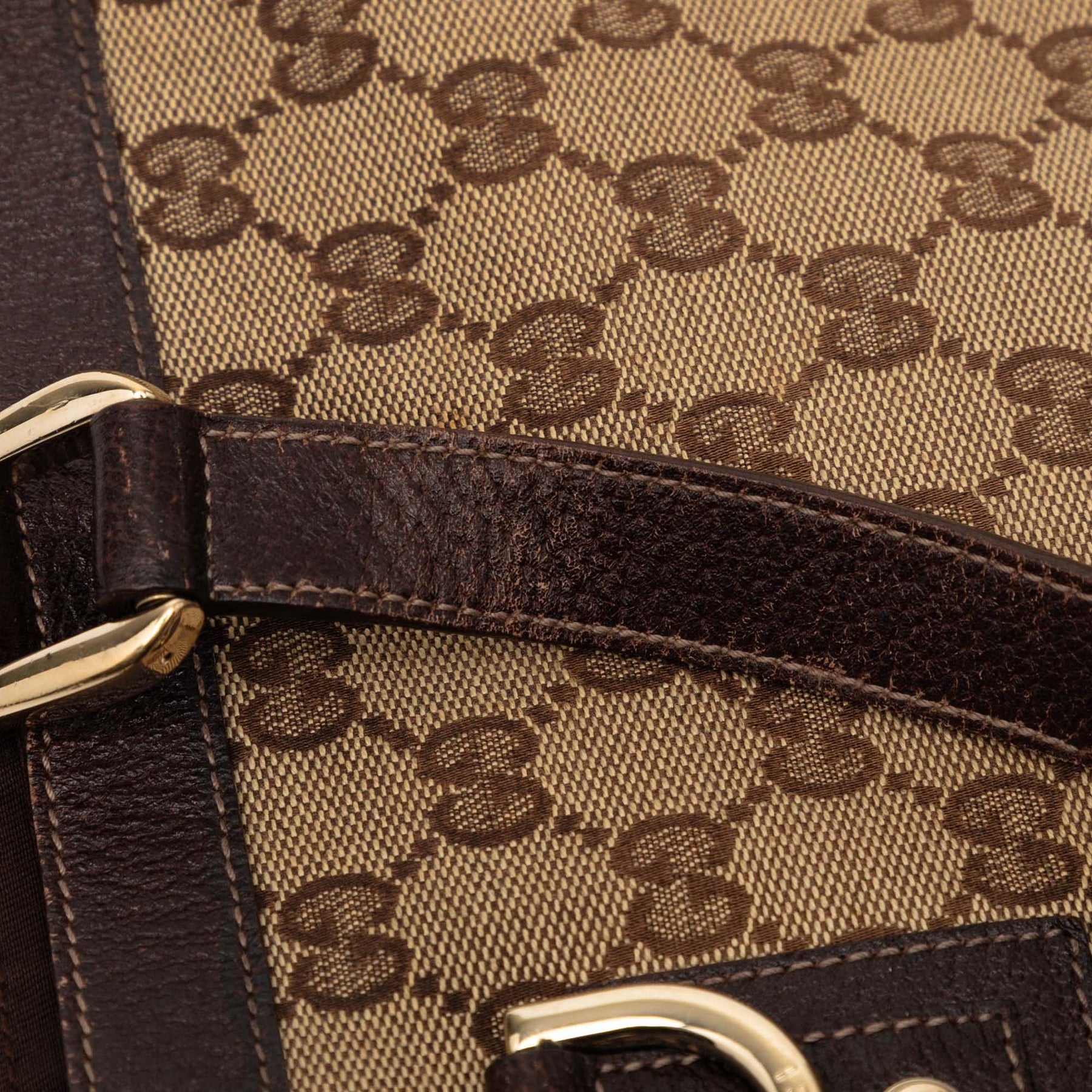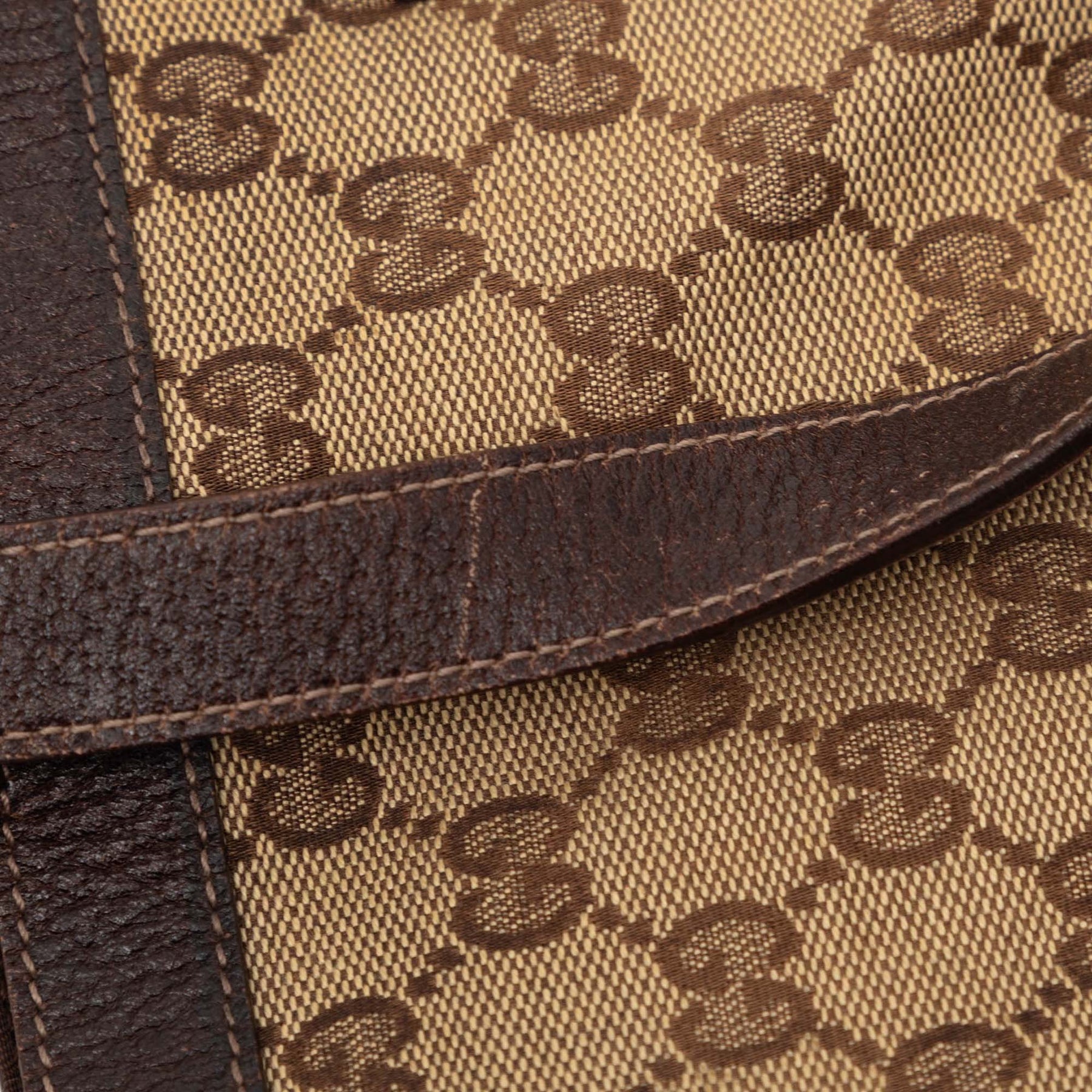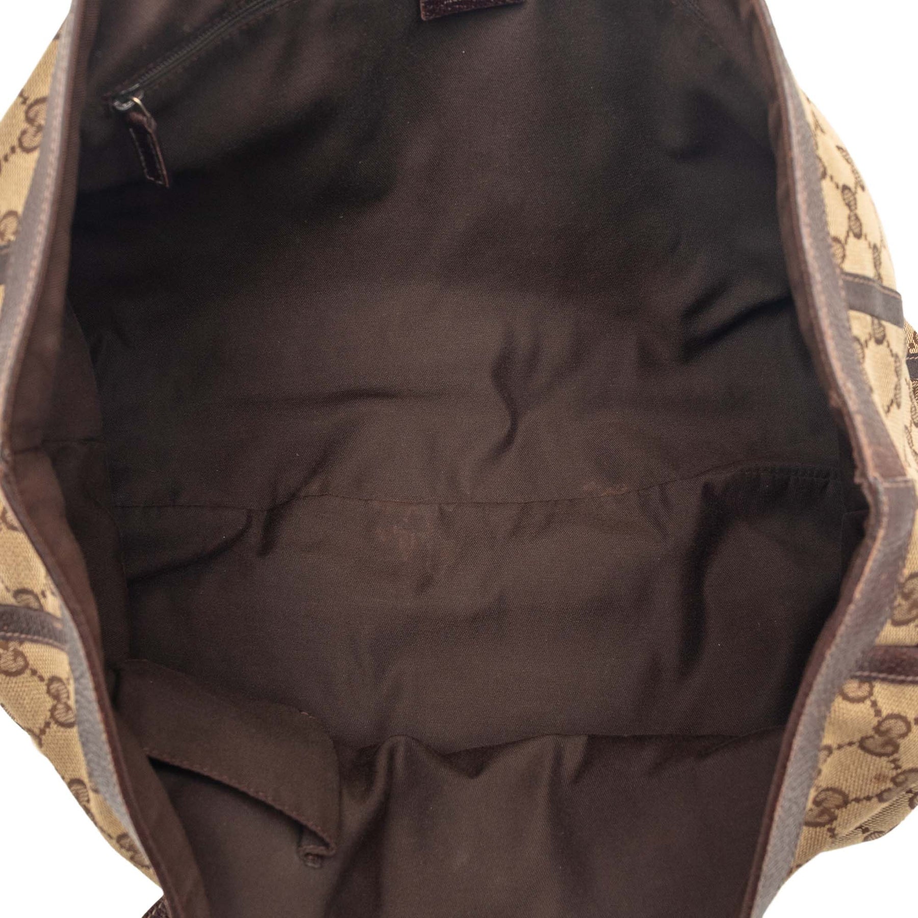 Ce sac cabas est en toile avec finitions en cuir, anses plates en cuir, ouverture sur le dessus avec fermeture magnétique, et poches intérieures zippées et plaquées. Son état est correct.