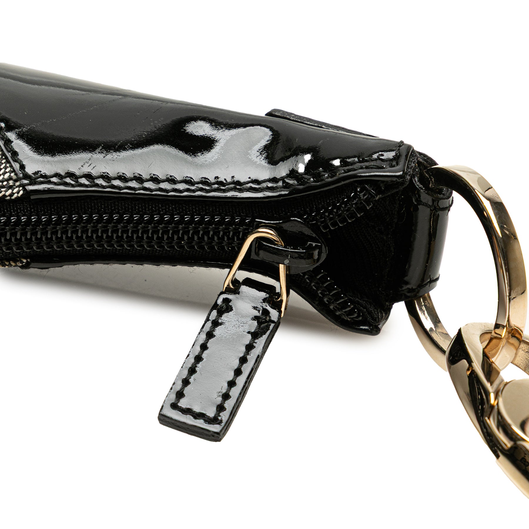 Ce sac hobo est en toile avec des finitions en cuir verni, une bandoulière en cuir roulé, une fermeture zippée sur le dessus et une poche intérieure zippée. Il est en excellent état.