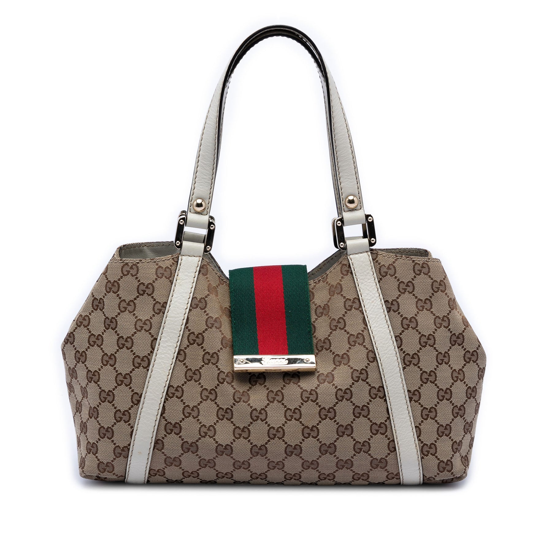 Le nouveau sac cabas Web pour femmes est confectionné en toile avec des finitions en cuir, des anses plates en cuir, une ouverture sur le dessus avec une sangle et une fermeture magnétique, ainsi que des poches intérieures zippées et plaquées. Il est en excellent état.