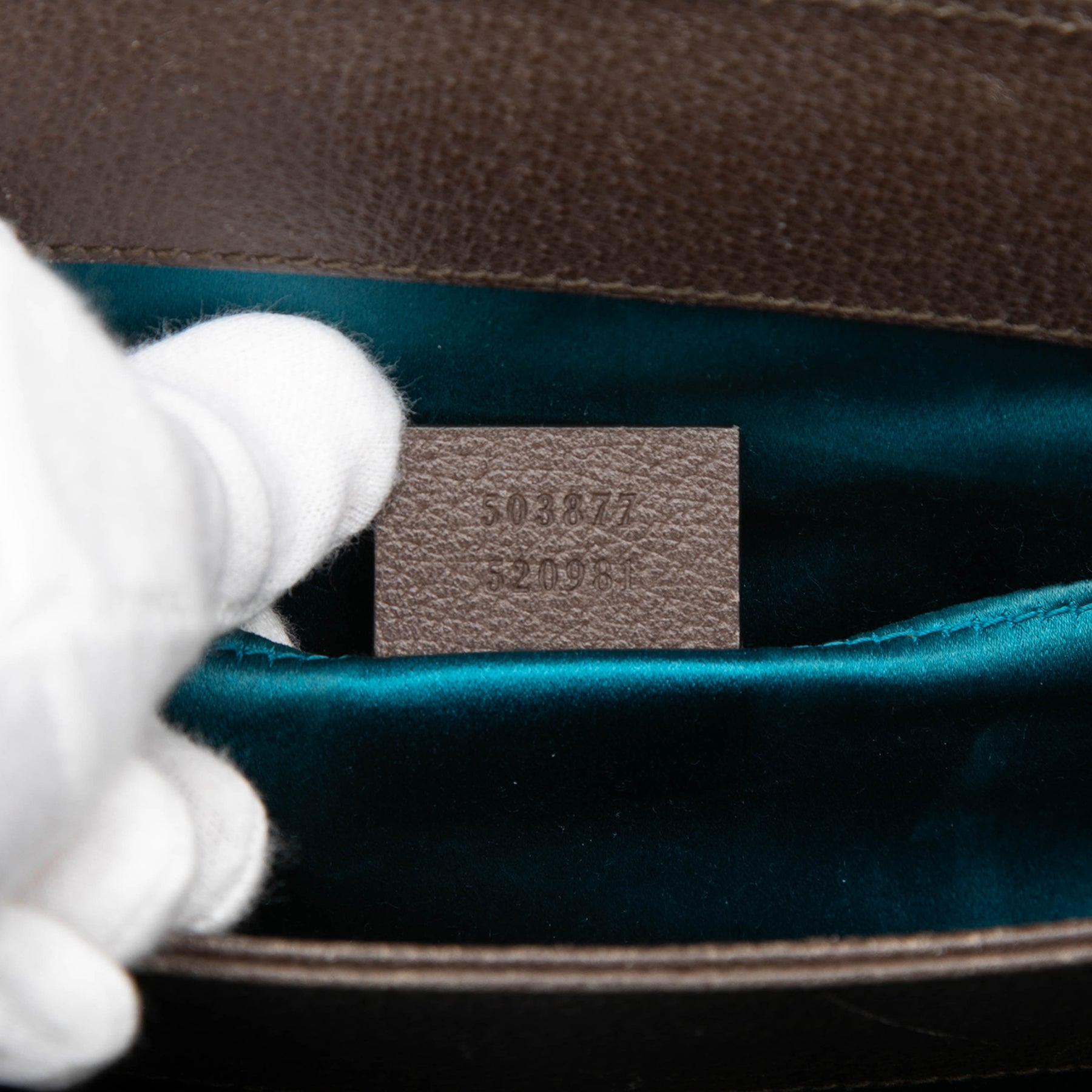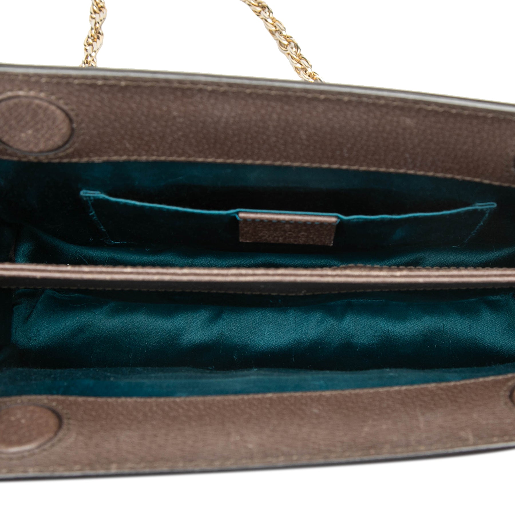 Le sac bandoulière Ophidia est confectionné en toile enduite avec des finitions en cuir, une bandoulière chaîne dorée, une fermeture à bouton-pression aimanté et une poche intérieure plaquée. Il est en bon état.