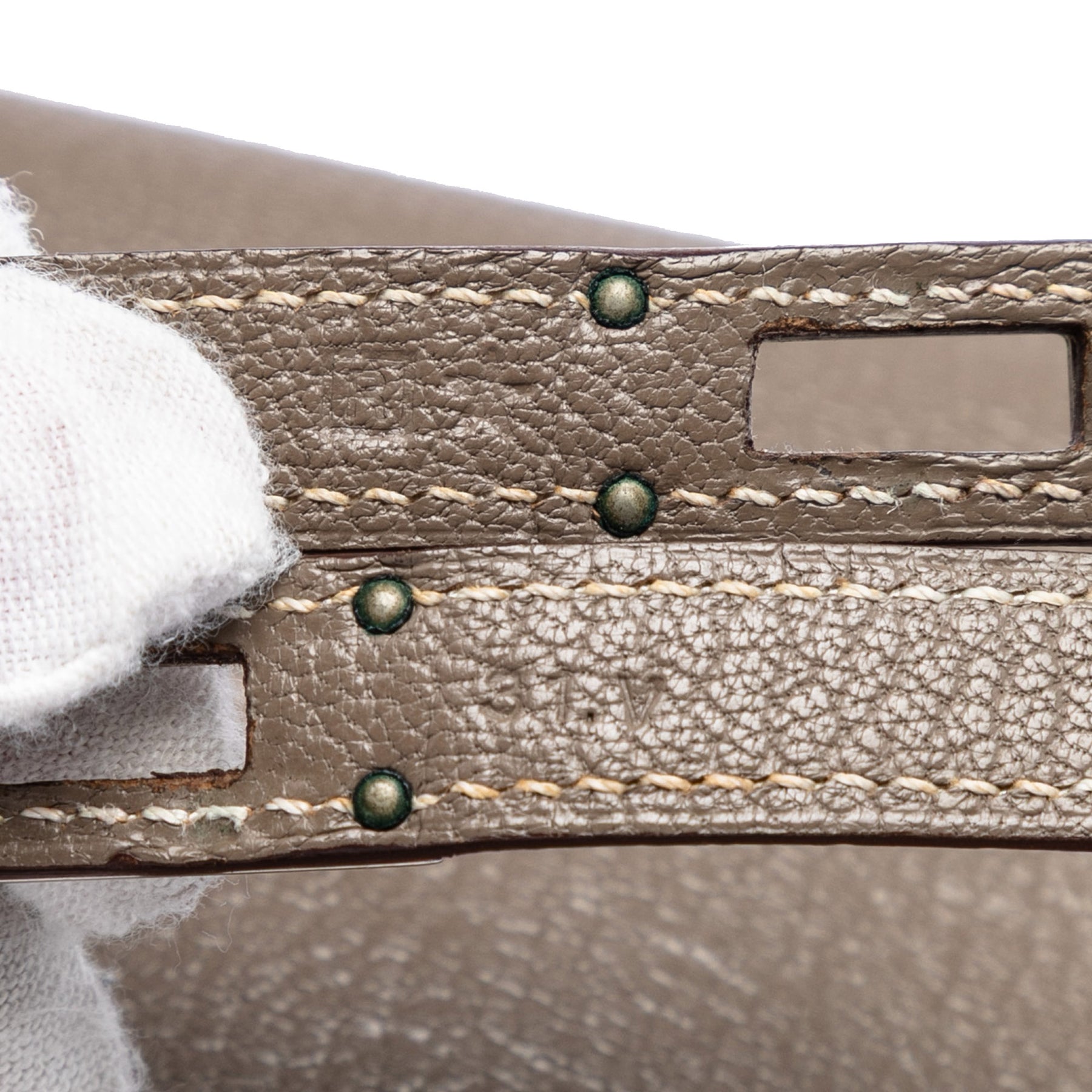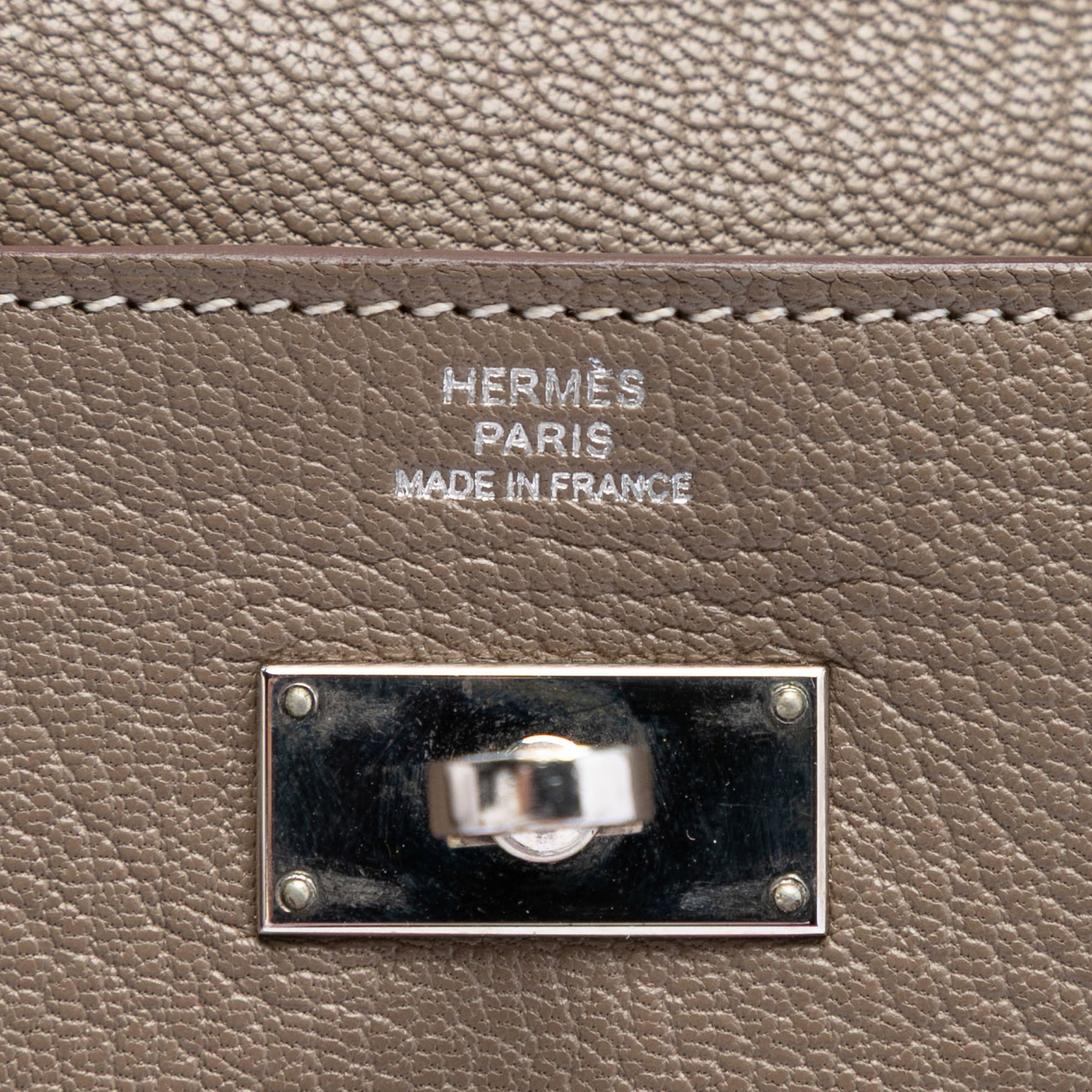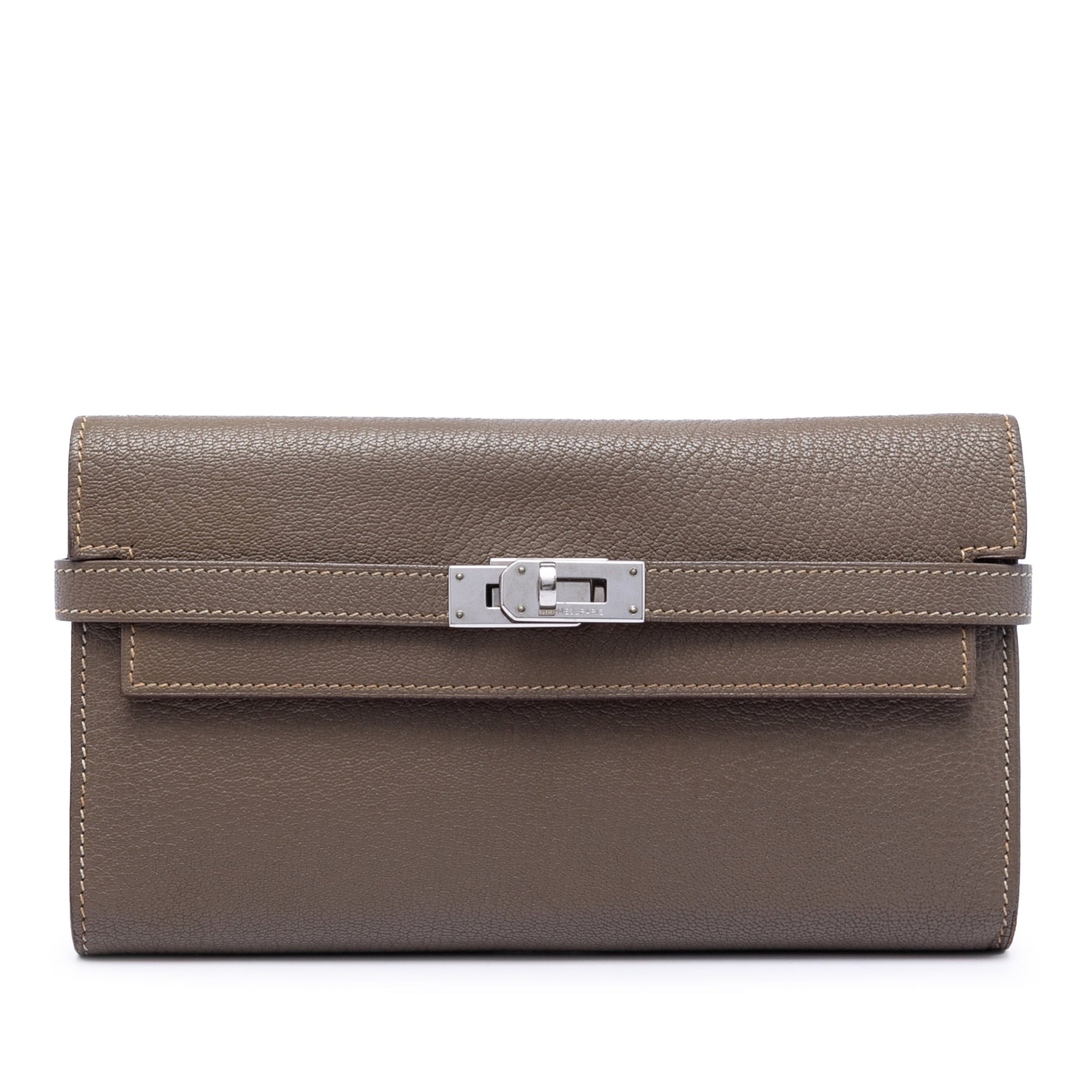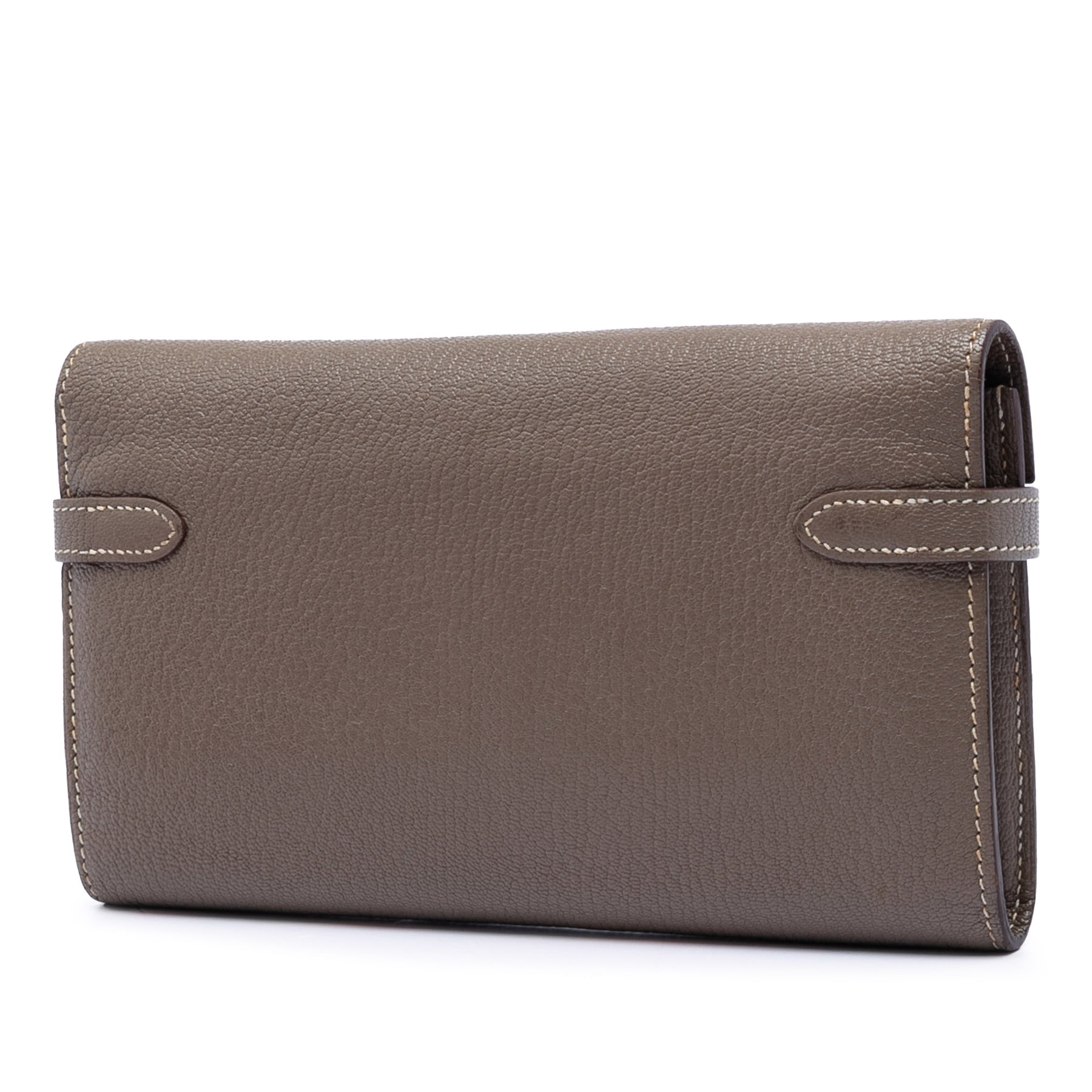 Ce portefeuille Kelly est en cuir de chèvre couleur étoupe, avec un rabat avant à fermeture pivotante et des poches intérieures zippées et plaquées. Il est en excellent état.