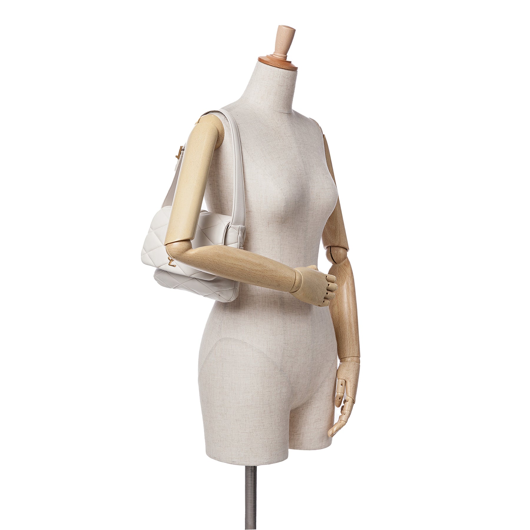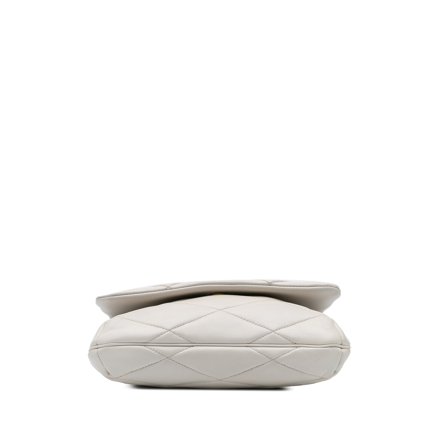 Le sac Le 57 est confectionné en cuir d'agneau matelassé et possède une bandoulière plate réglable en cuir, un rabat à fermeture magnétique, une poche extérieure plaquée et une poche intérieure plaquée. Il est en bon état.