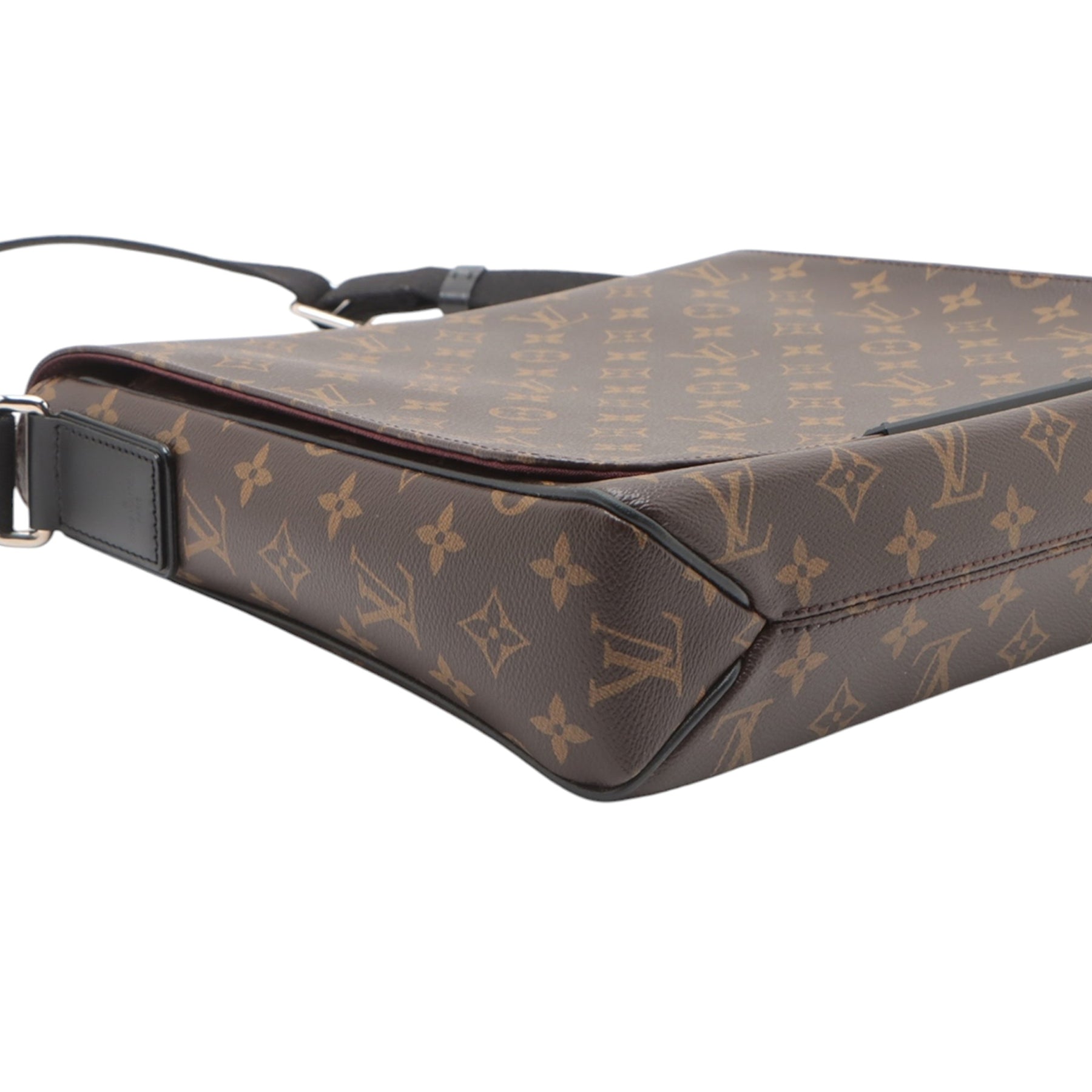 Le Macassar District MM est doté d'une toile monogrammée, d'une bandoulière plate réglable, d'un rabat avant avec fermeture à pression magnétique, d'une poche arrière extérieure zippée et de poches intérieures plaquées. Il est en excellent état.