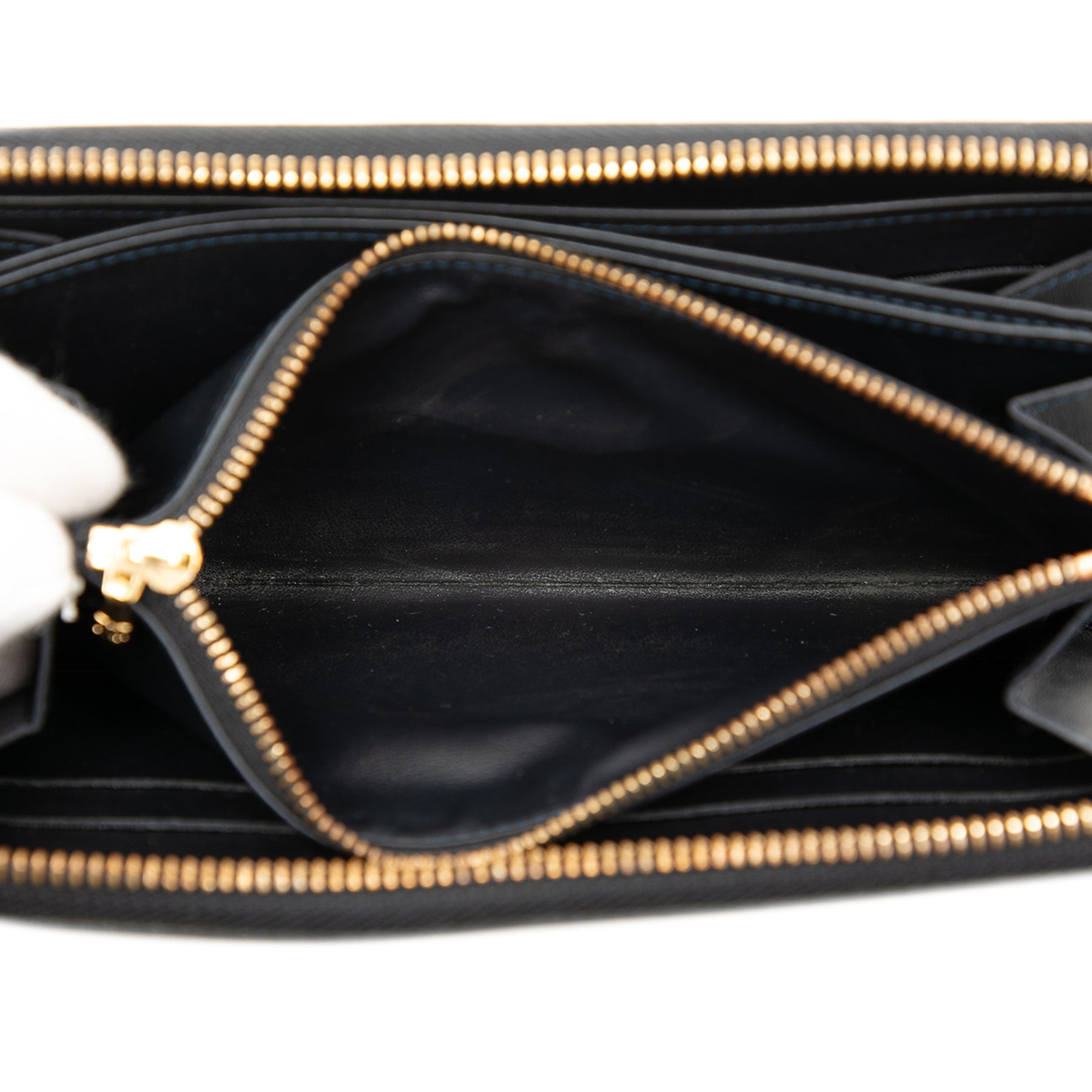 Ce portefeuille long est en cuir verni, possède une fermeture éclair, un compartiment intérieur zippé, des poches plaquées et des emplacements pour cartes. Il est en bon état.