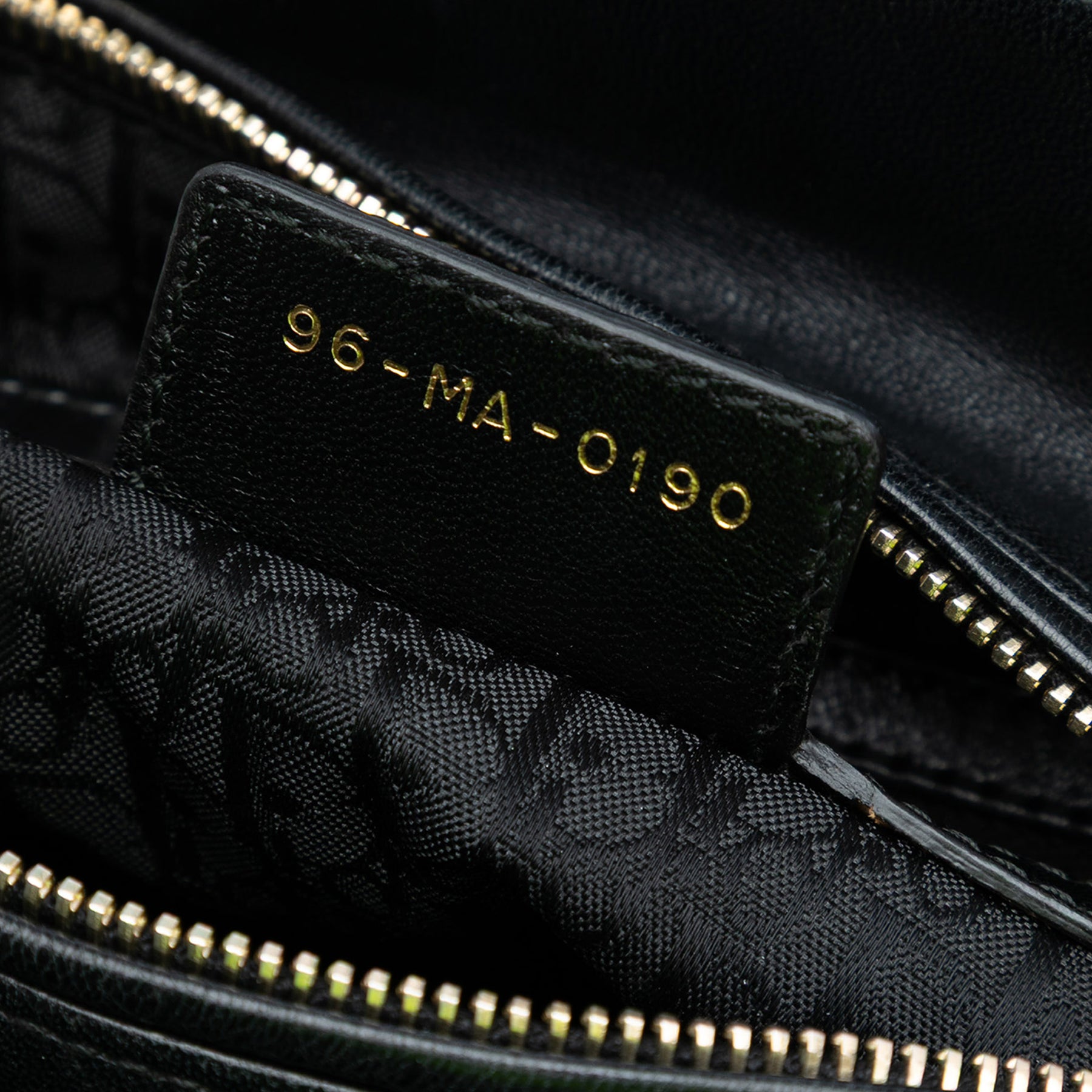 Le Lady Dior est doté d'un corps en cuir d'agneau matelassé orné de perles, de poignées supérieures plates en cuir, d'une bandoulière plate amovible en cuir, d'une fermeture zippée sur le dessus et d'une poche intérieure zippée. Il est en bon état.