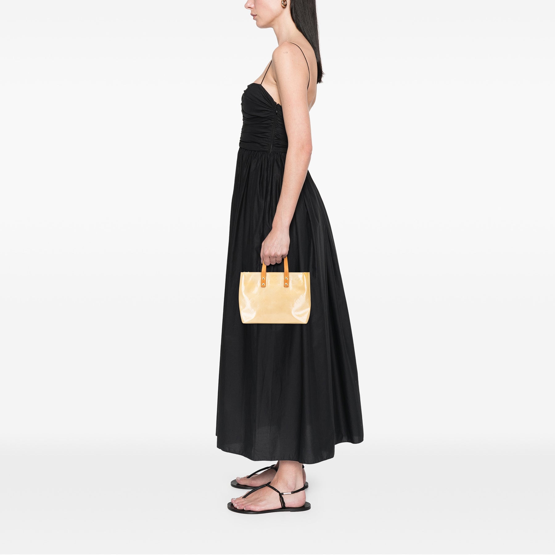 Le sac Reade PM est doté d'un corps en cuir verni monogrammé, de poignées plates en cuir vachetta, d'une ouverture sur le dessus et d'une poche intérieure zippée. Il est en bon état.