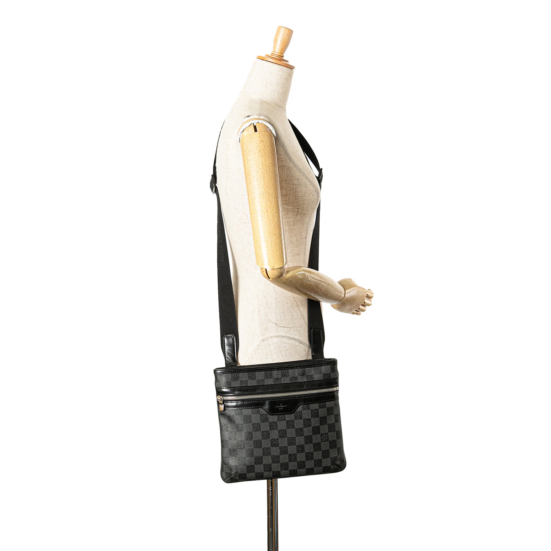Le Thomas est doté d'un corps en toile Damier, d'une bandoulière plate réglable, d'une fermeture zippée sur le dessus, d'une poche extérieure zippée sur le devant et de poches intérieures plaquées. Il est en bon état.