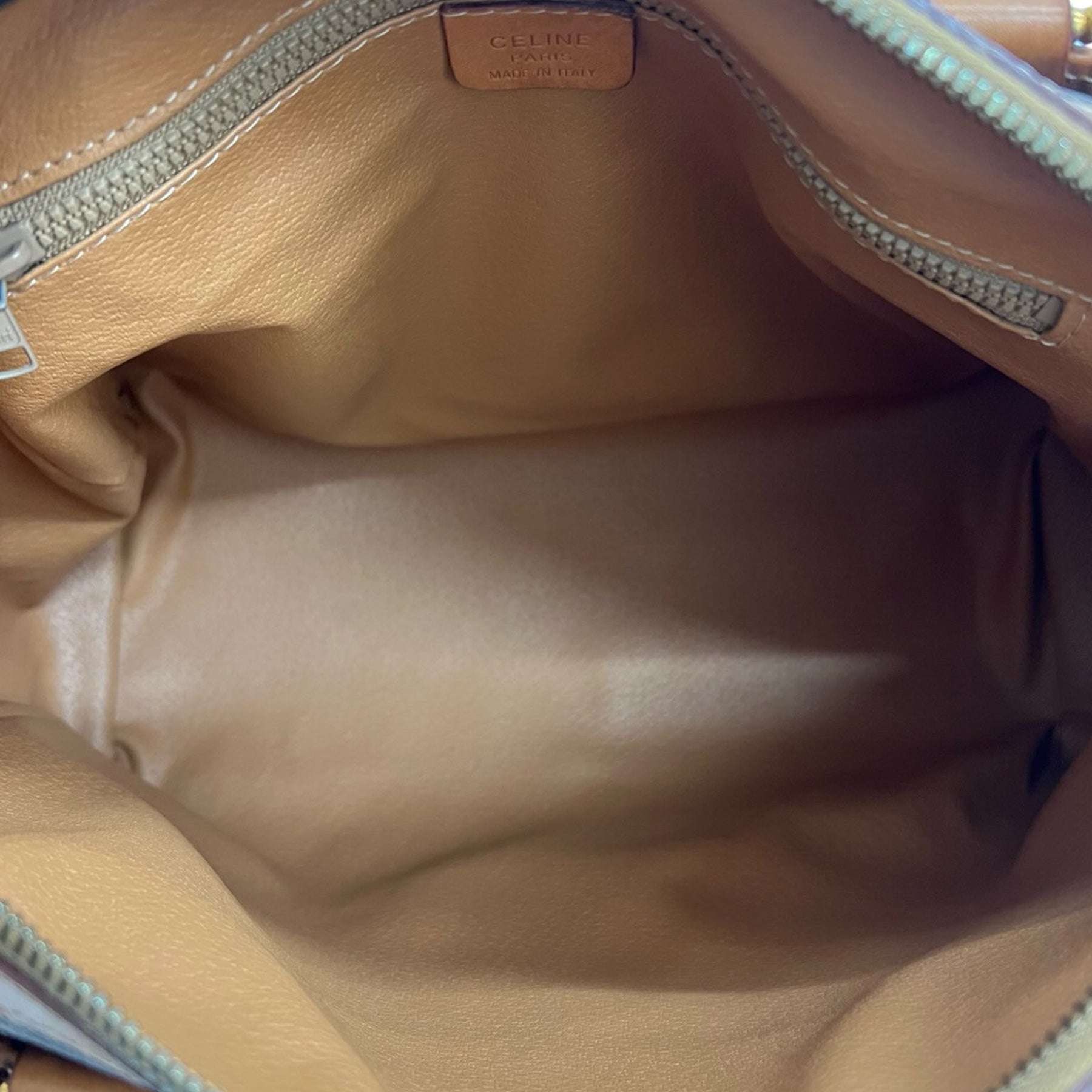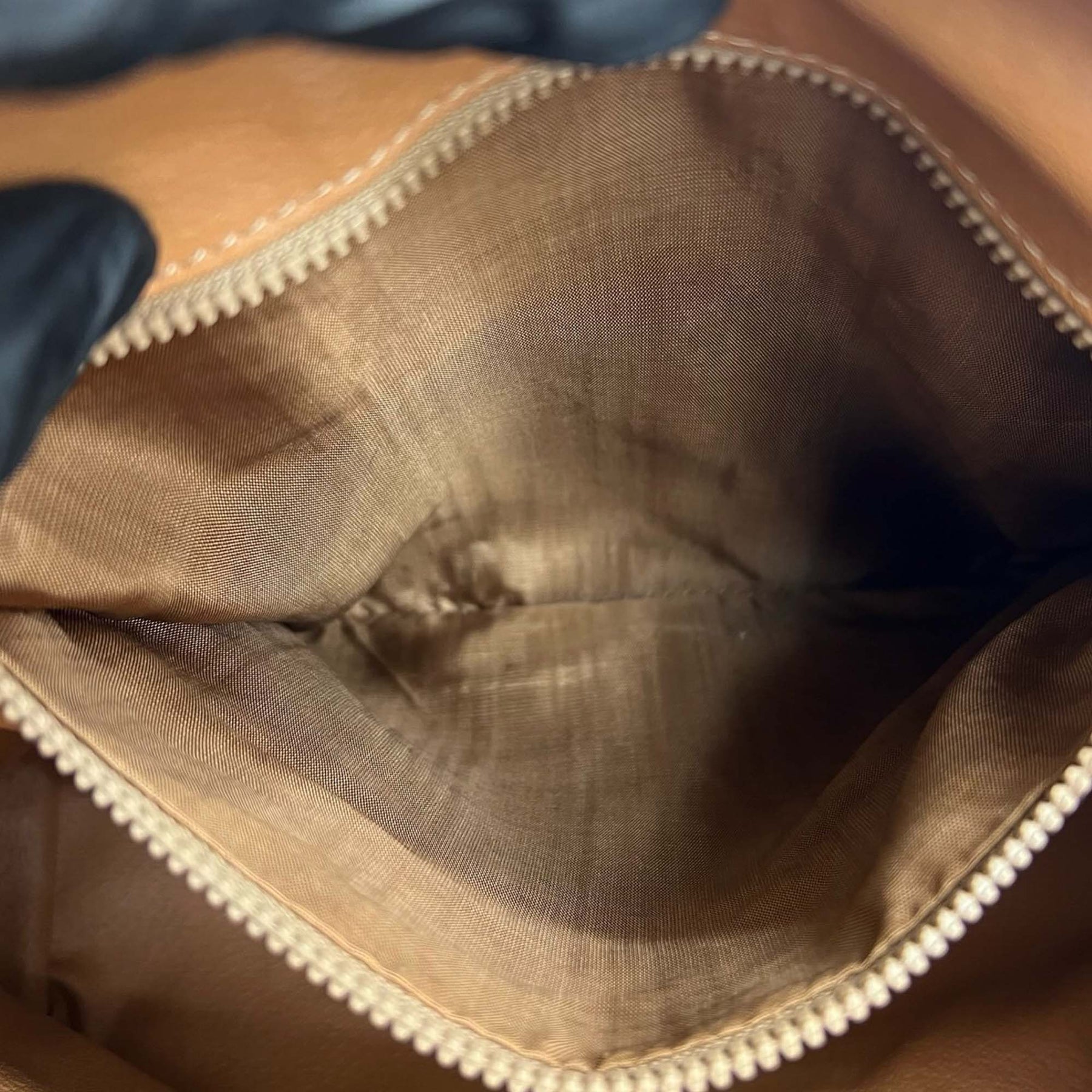 Ce sac Boston est confectionné en toile enduite avec des finitions en cuir, des anses roulées en cuir, une fermeture zippée sur le dessus et une poche intérieure zippée. Il est en bon état.