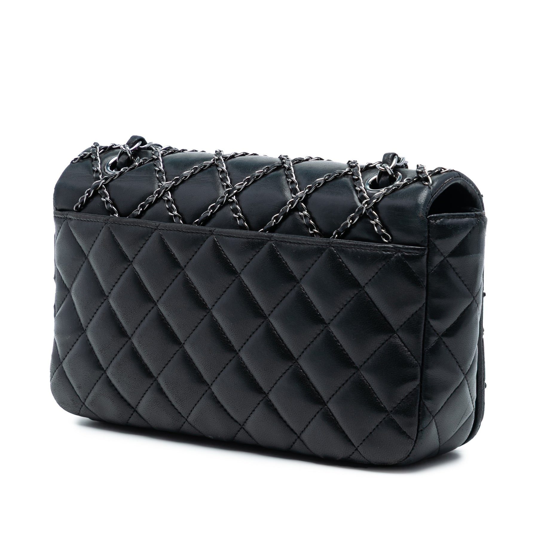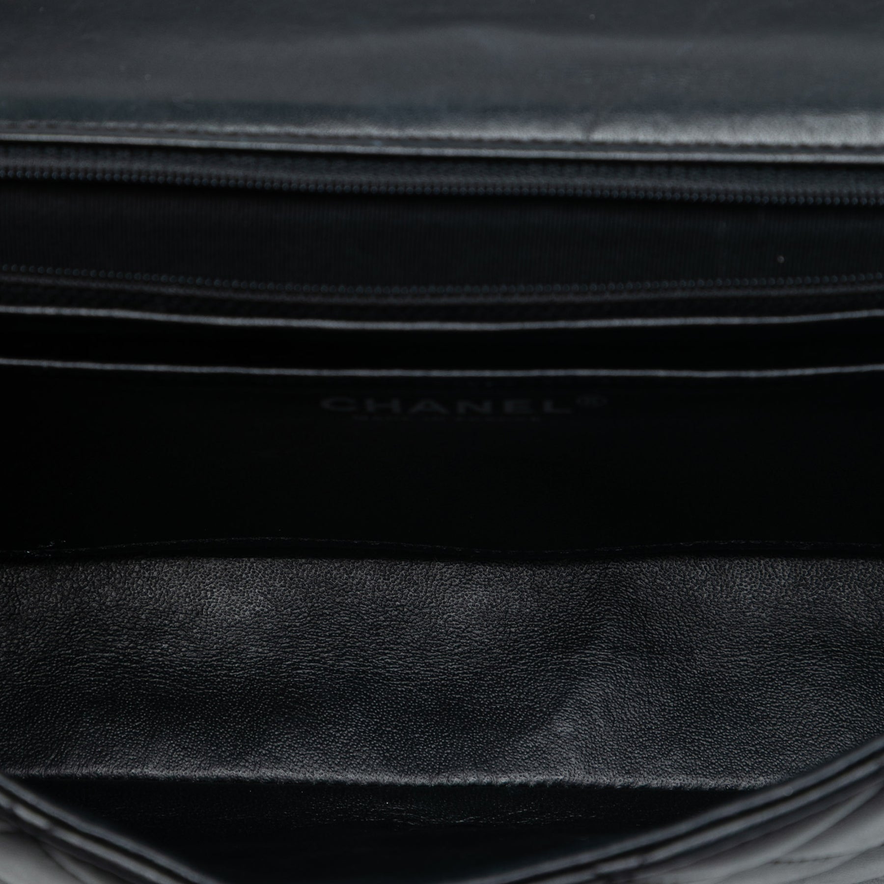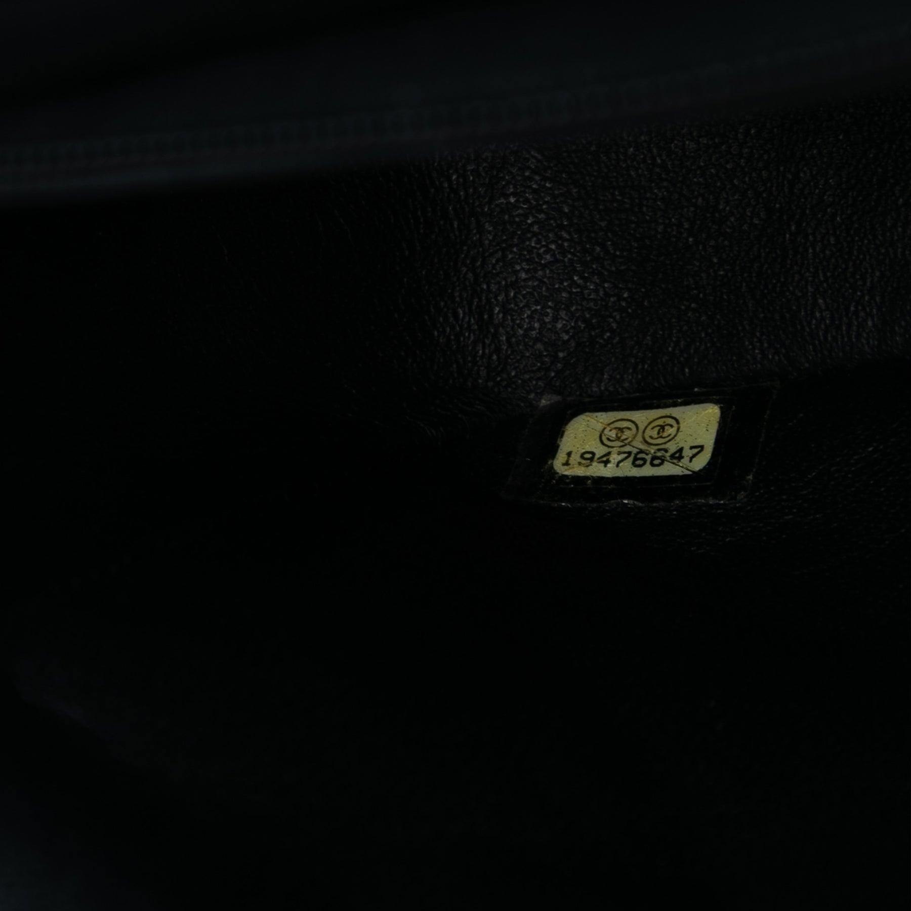 Ce sac à rabat est confectionné en cuir d'agneau matelassé et possède une bandoulière en chaîne tressée avec protection en cuir, un rabat avant orné du double C et d'une fermeture à tourniquet, ainsi que des poches intérieures zippées et plaquées. Il est en excellent état.