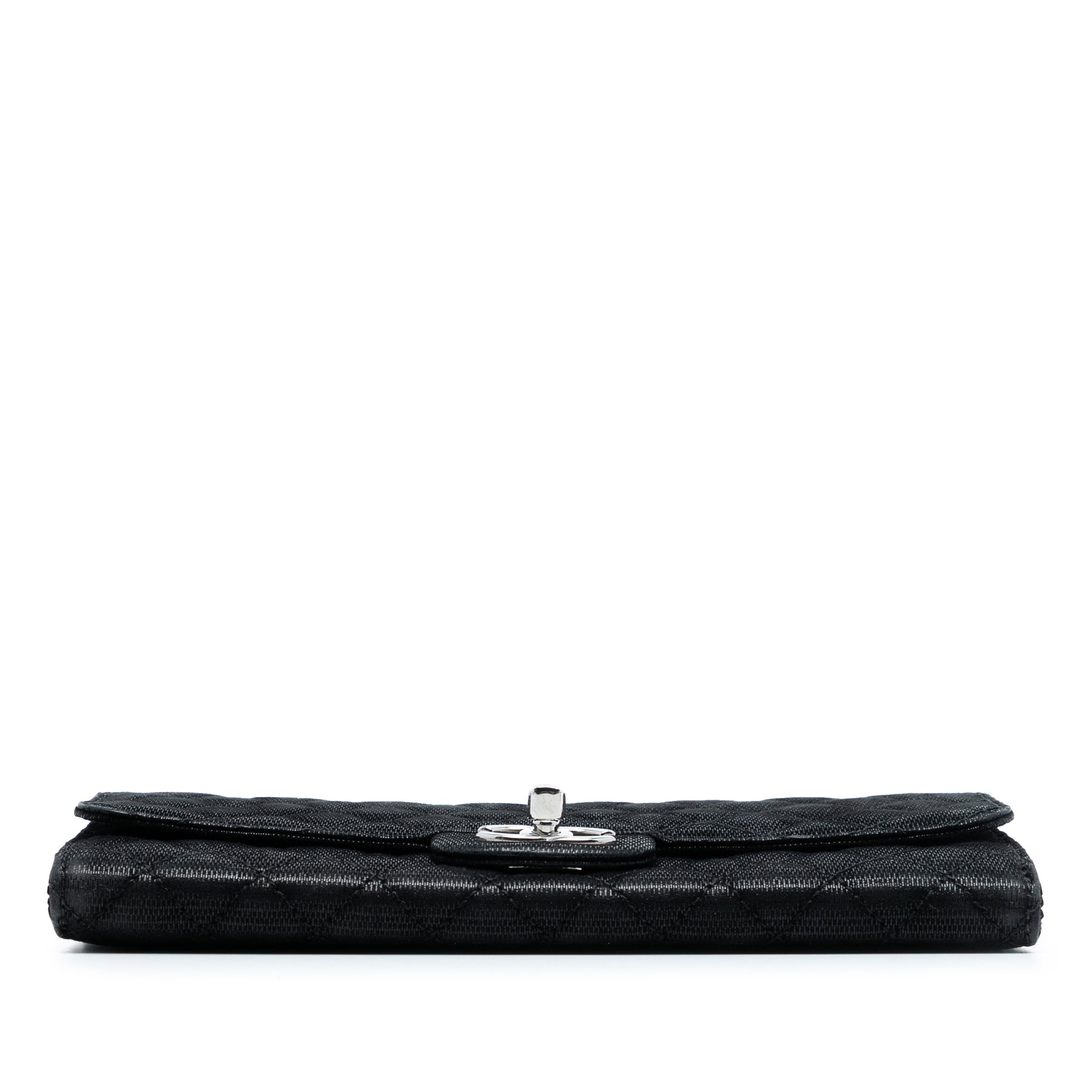 Ce sac à rabat est confectionné en toile enduite matelassée et possède une bandoulière en chaîne tressée de cuir, un rabat avant avec fermeture à tourniquet, ainsi que des poches intérieures zippées et plaquées. Il est en excellent état.