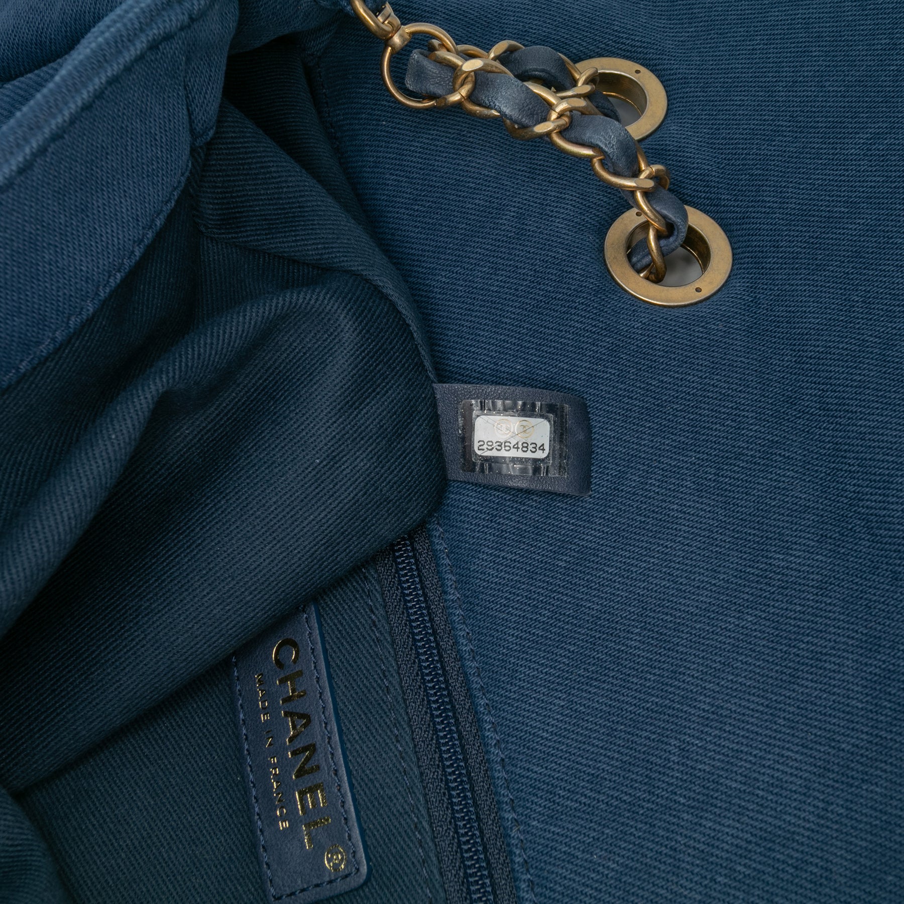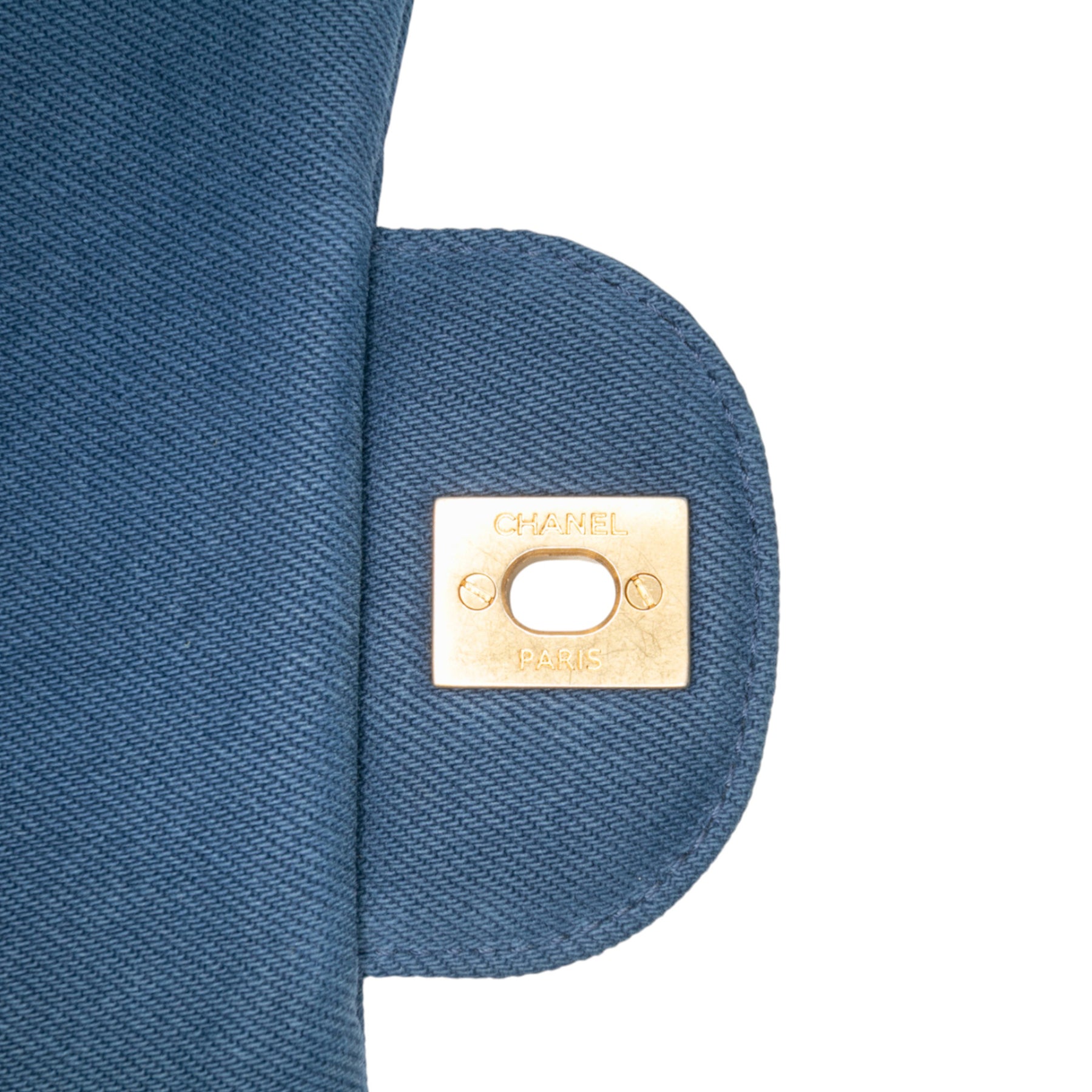 Ce sac bandoulière est doté d'un corps en denim matelassé, d'une bandoulière en cuir doré tressé à maillons, d'un rabat avant avec fermoir à vis, d'une poche extérieure plaquée au dos et d'une poche intérieure zippée. Il est en bon état.