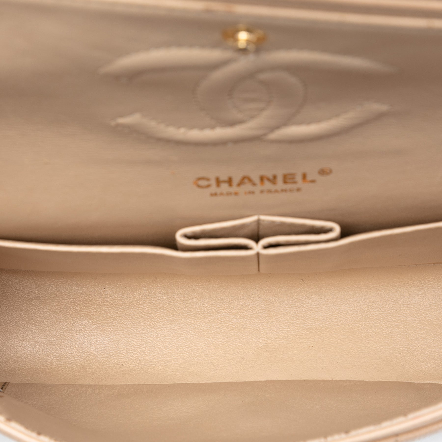 Ce sac bandoulière est confectionné en cuir caviar matelassé et possède une bandoulière en chaîne tressée, un double rabat avant avec fermoir CC, une poche plaquée extérieure au dos, ainsi que des poches intérieures zippées et plaquées. Il est en bon état.
