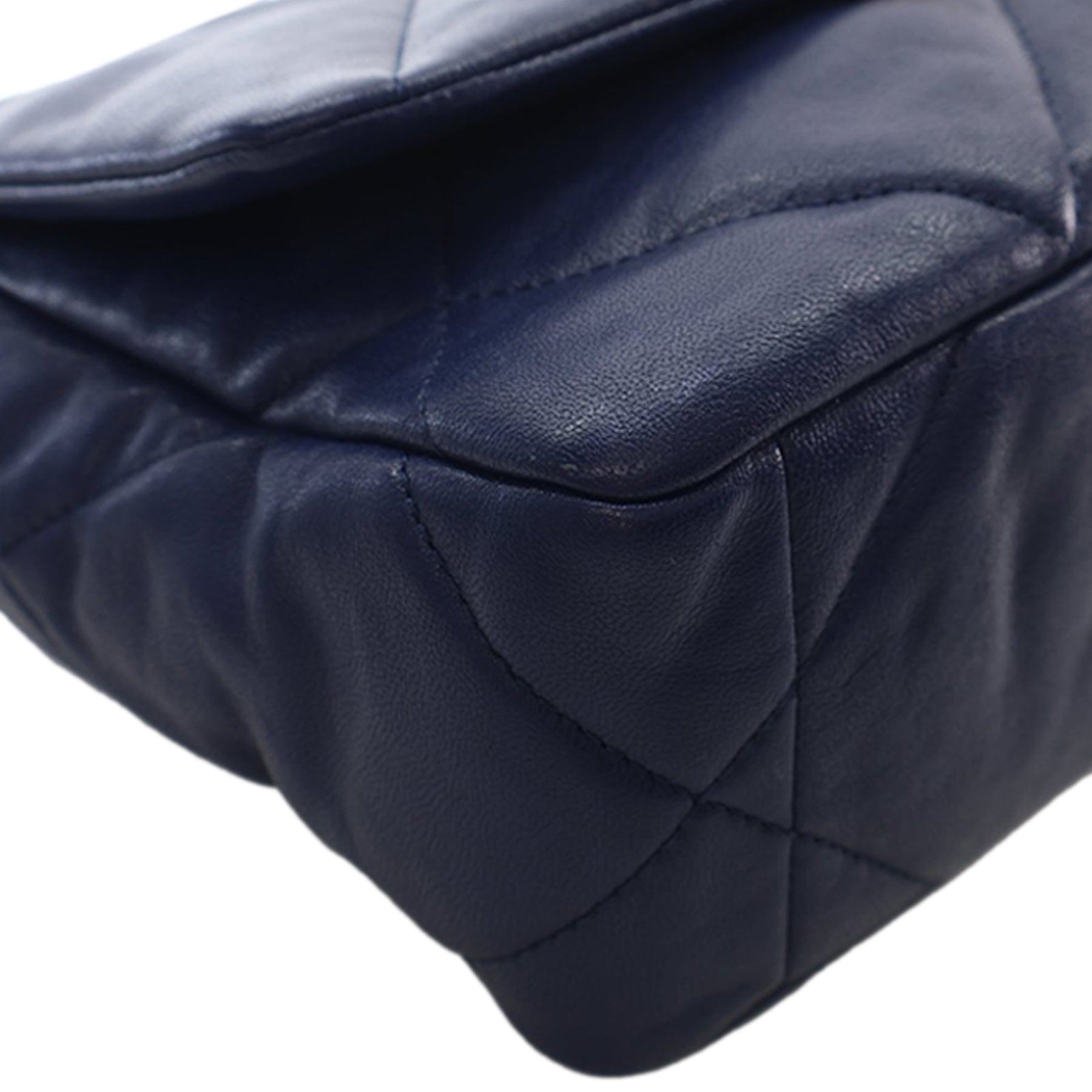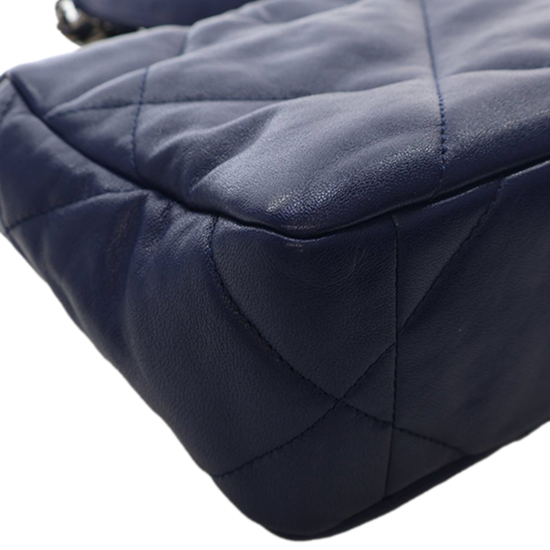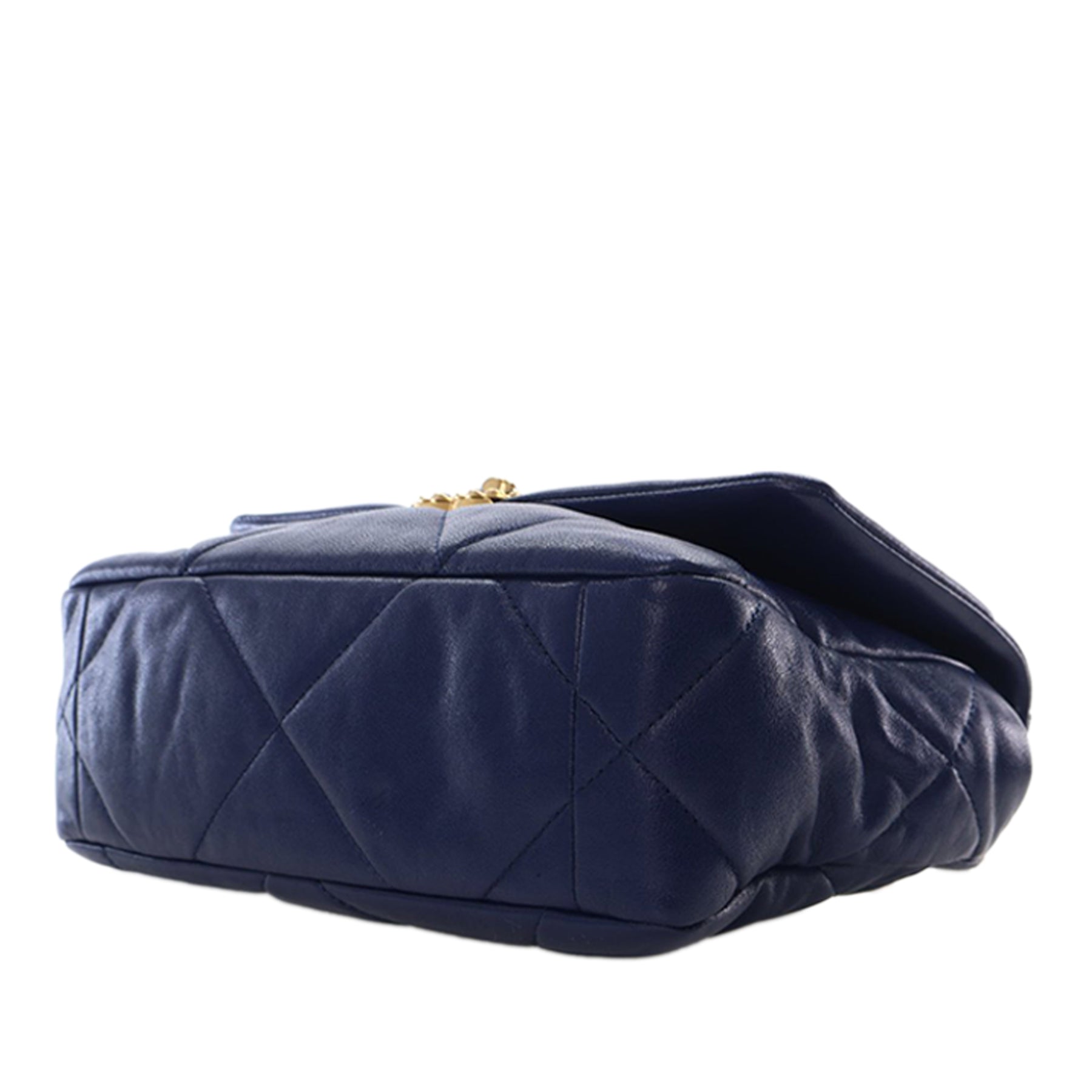 Le sac à rabat Medium 19 est confectionné en cuir d'agneau matelassé et présente une anse chaîne dorée, une bandoulière chaîne en cuir tressé, un rabat avec fermoir CC, une poche plaquée extérieure au dos et une poche intérieure zippée. Il est en excellent état.