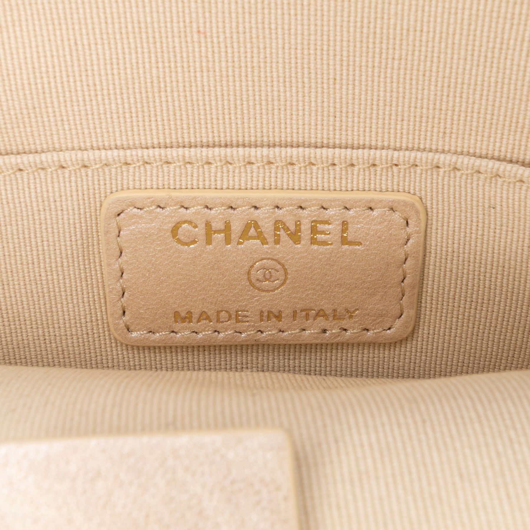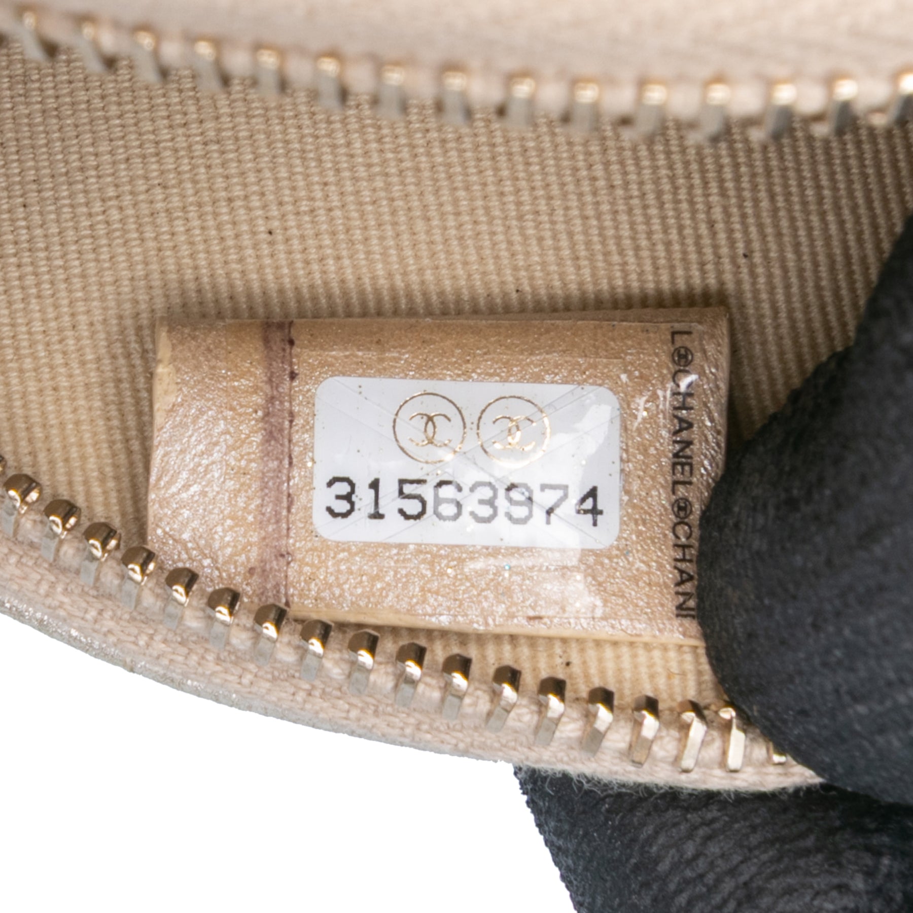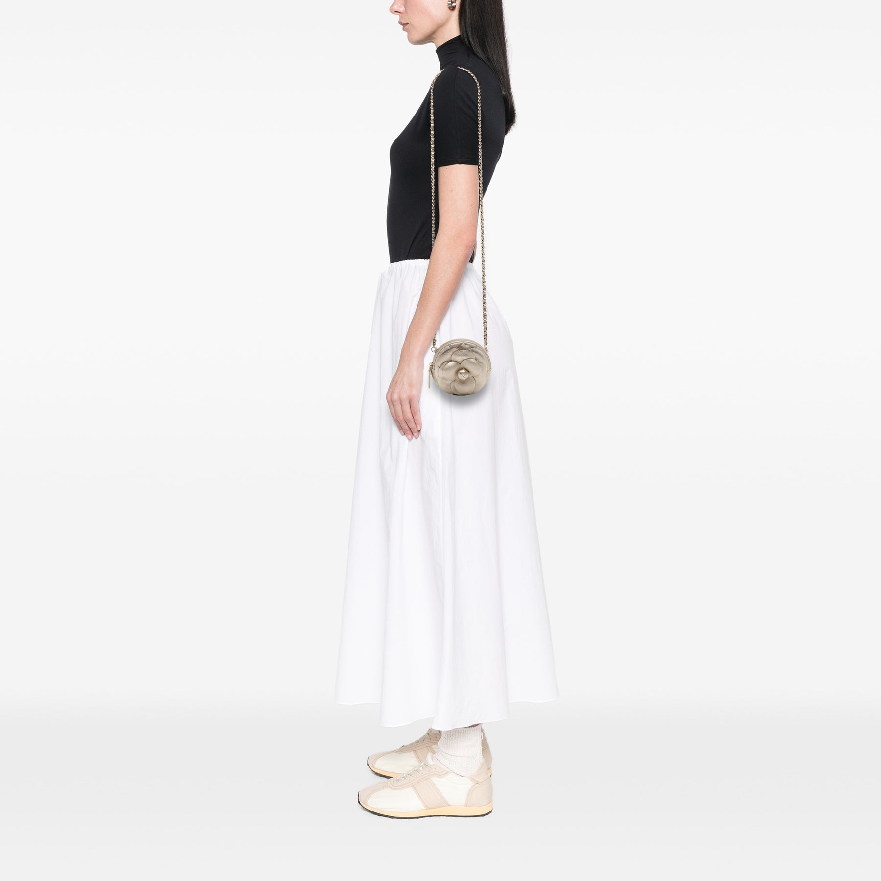 Ce sac bandoulière est doté d'un corps en cuir d'agneau métallisé, d'une bandoulière chaîne en cuir tressé, d'une fermeture zippée sur le dessus et d'une poche intérieure. Il est en excellent état.
