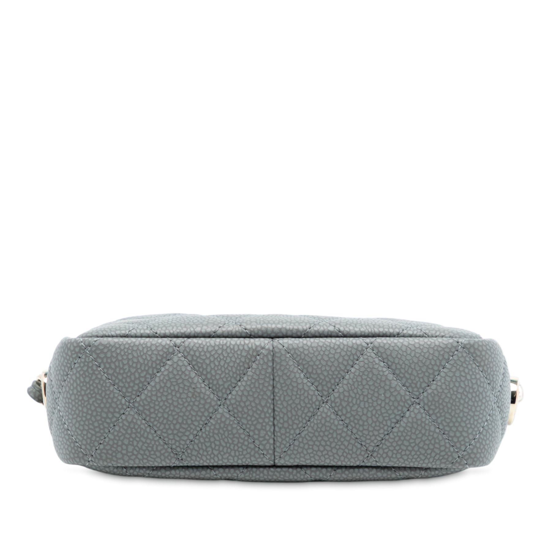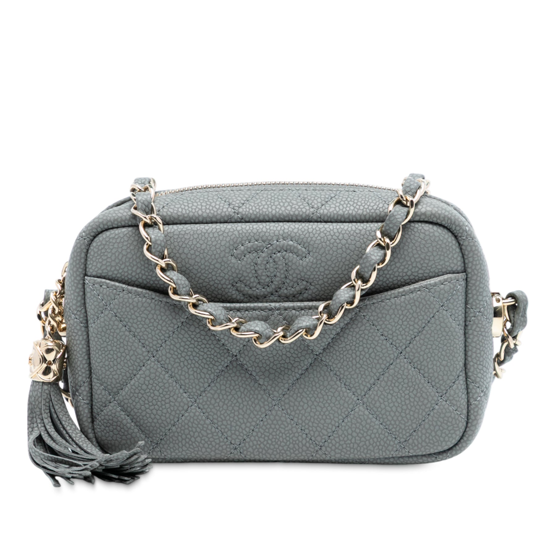 Ce sac bandoulière est confectionné en cuir caviar matelassé et possède une bandoulière en chaîne tressée de cuir, une fermeture zippée sur le dessus ornée d'un pompon, ainsi qu'une poche plaquée extérieure sur le devant. Il est en excellent état.