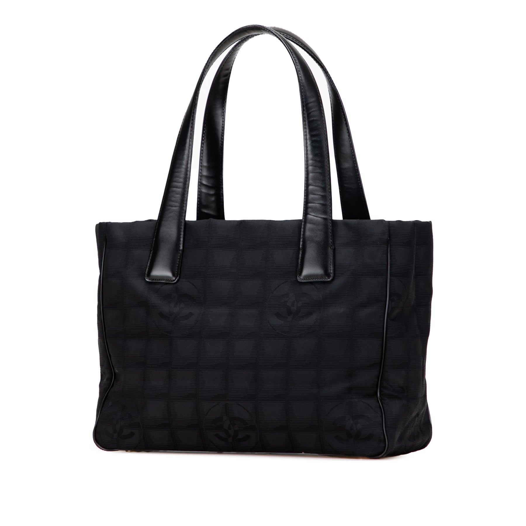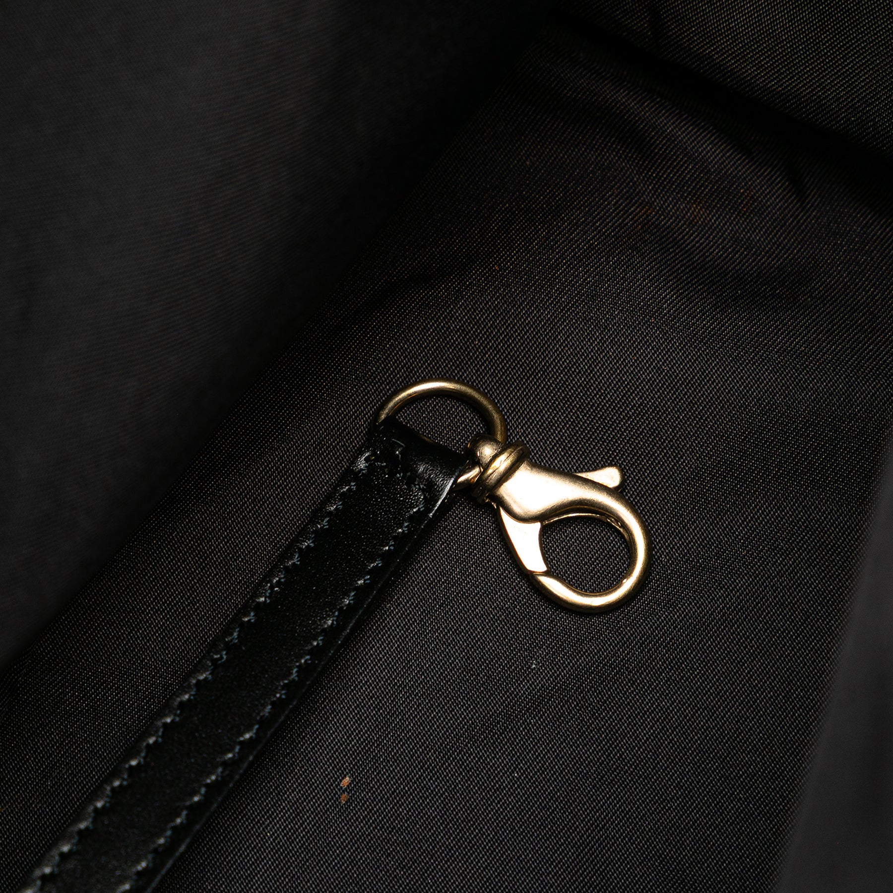 Ce sac fourre-tout est doté d'un corps en nylon, de sangles plates en cuir, d'un dessus ouvert et de poches intérieures zippées. Il est en bon état.
