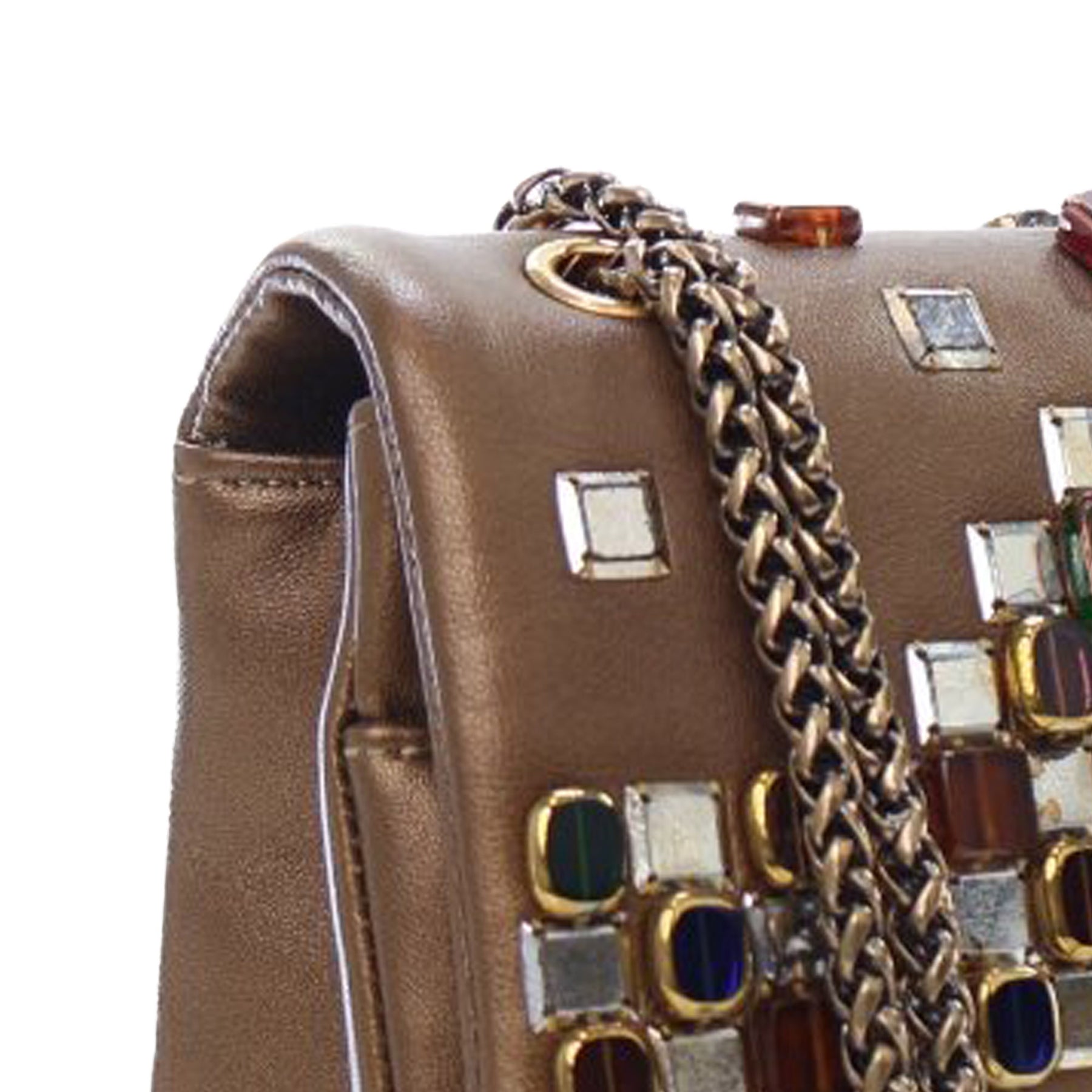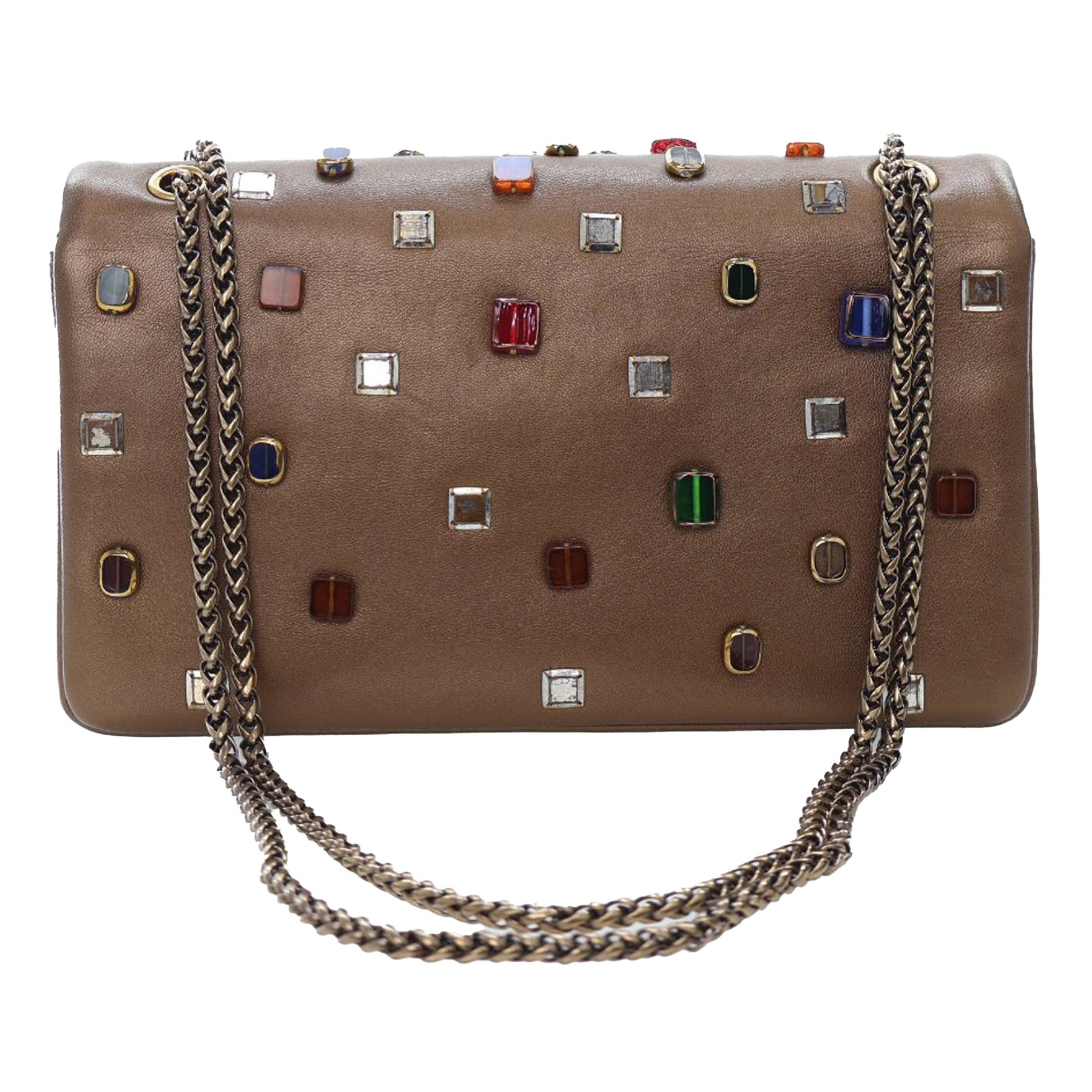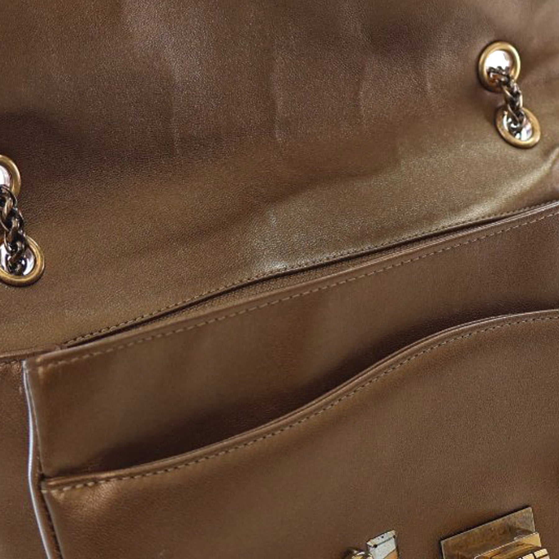 Ce sac à rabat réédité présente un corps en cuir orné de détails, une bandoulière chaîne dorée, un rabat avant avec fermeture à tourniquet, une poche plaquée extérieure au dos et des poches intérieures zippées et plaquées. Il est en excellent état.