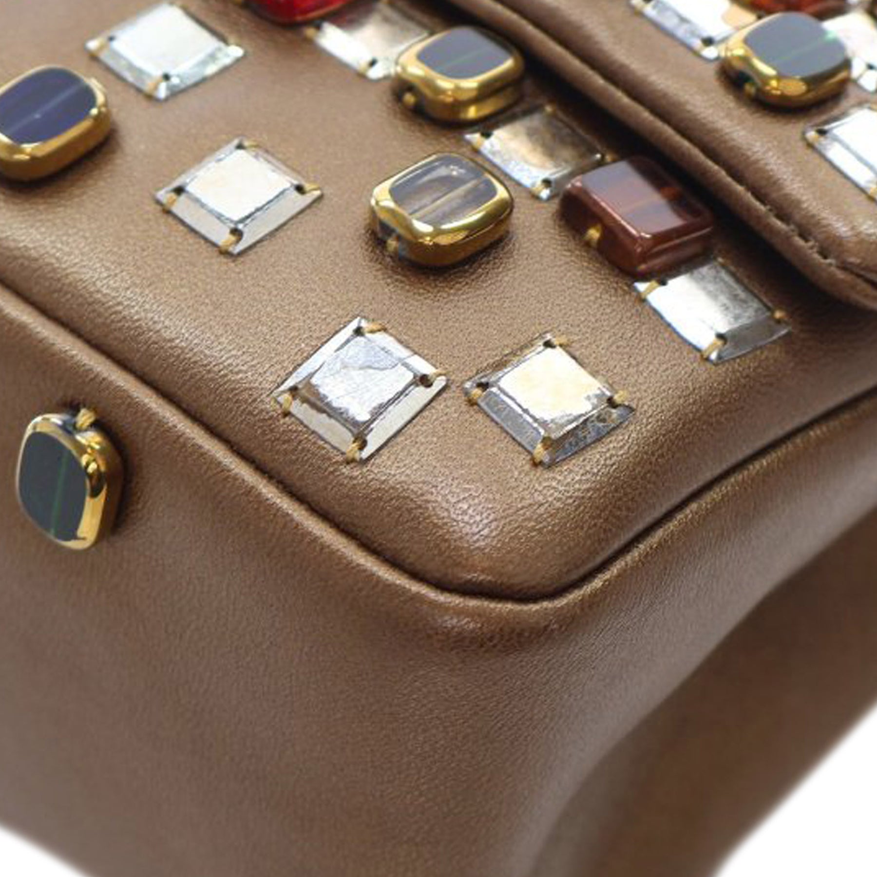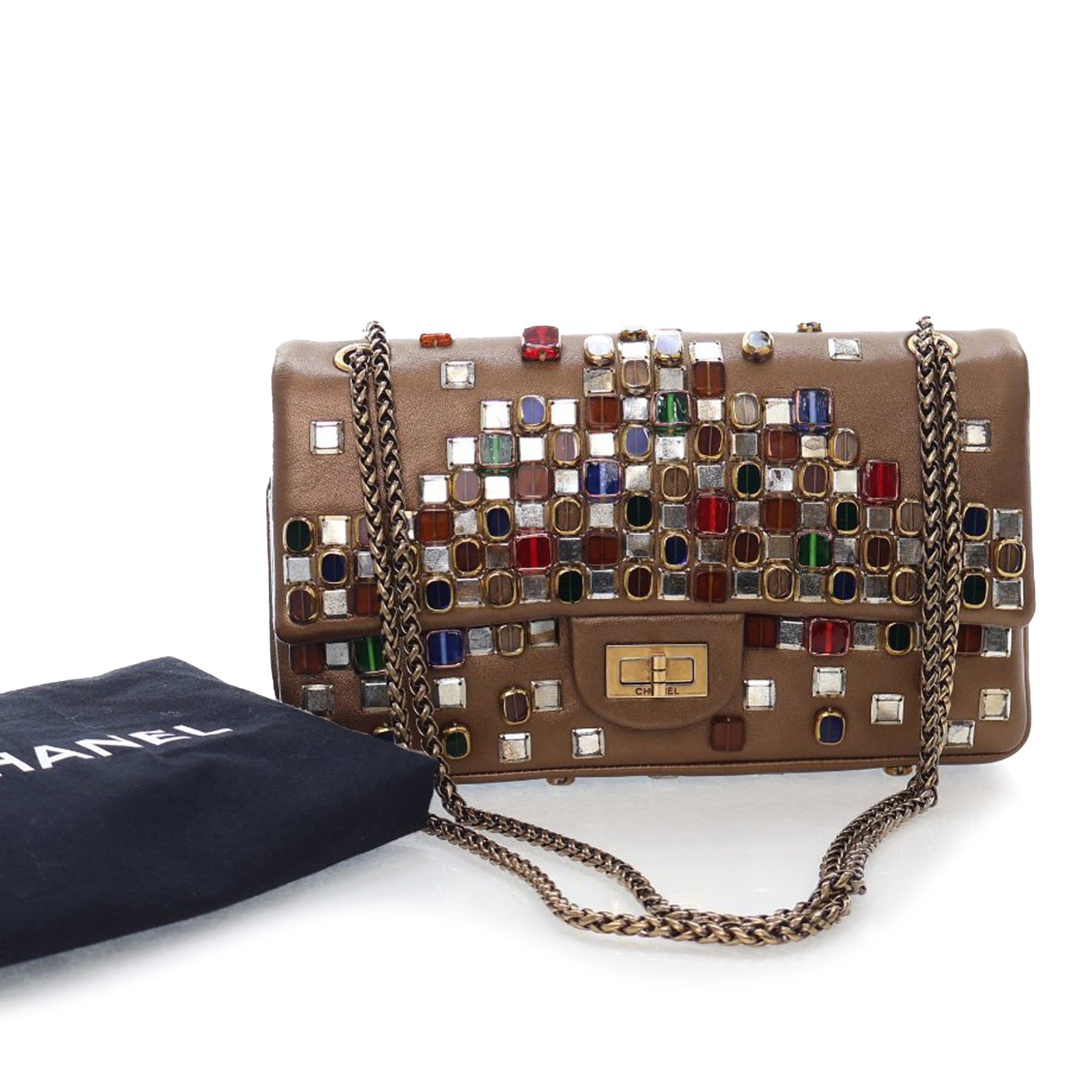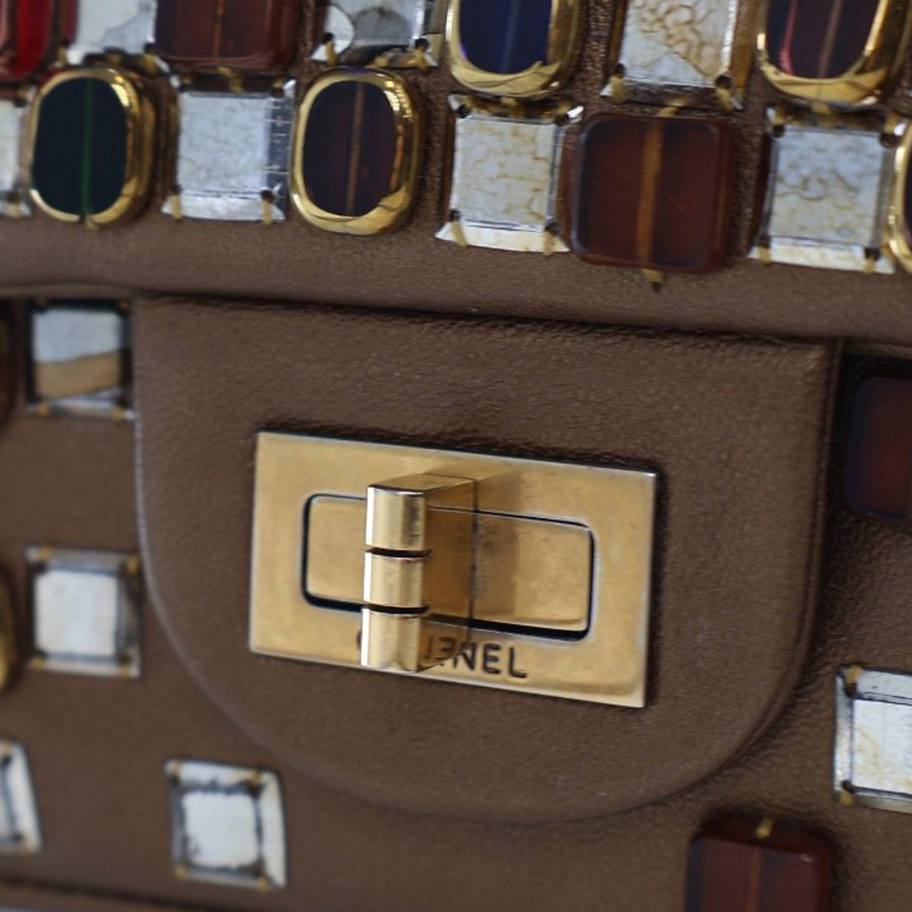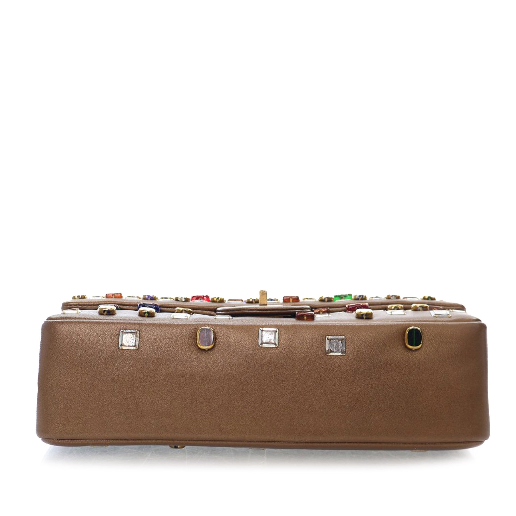 Ce sac à rabat réédité présente un corps en cuir orné de détails, une bandoulière chaîne dorée, un rabat avant avec fermeture à tourniquet, une poche plaquée extérieure au dos et des poches intérieures zippées et plaquées. Il est en excellent état.