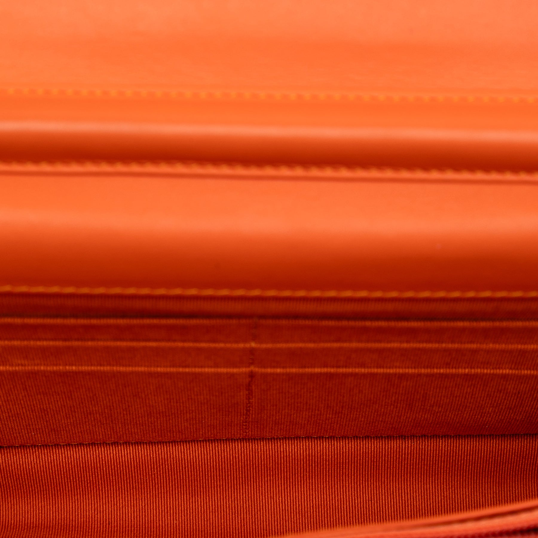 Ce portefeuille à chaîne est confectionné en cuir de chèvre verni matelassé et possède une bandoulière en chaîne tressée de cuir, un rabat à fermeture pression, ainsi que des poches intérieures zippées et plaquées. Il est en excellent état.