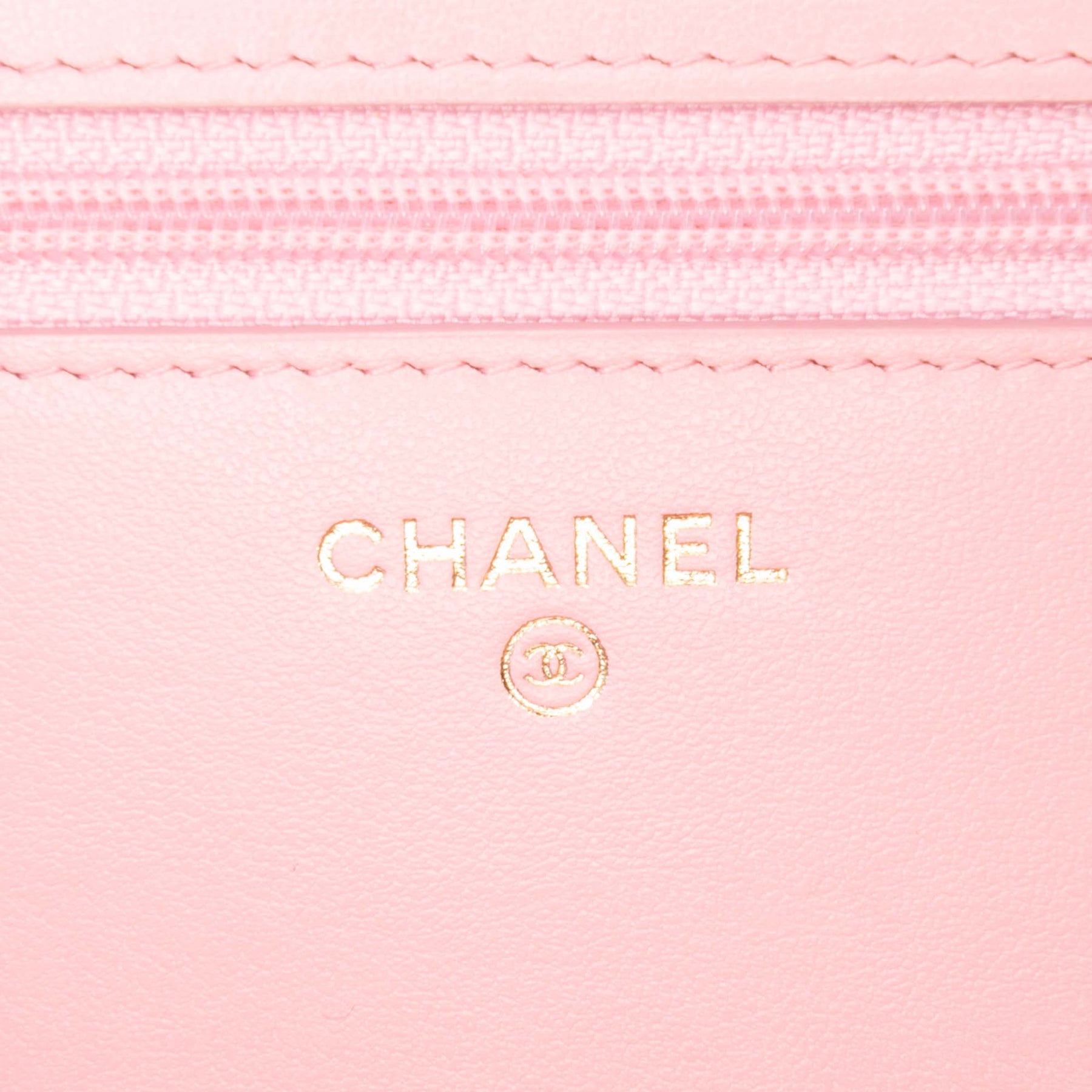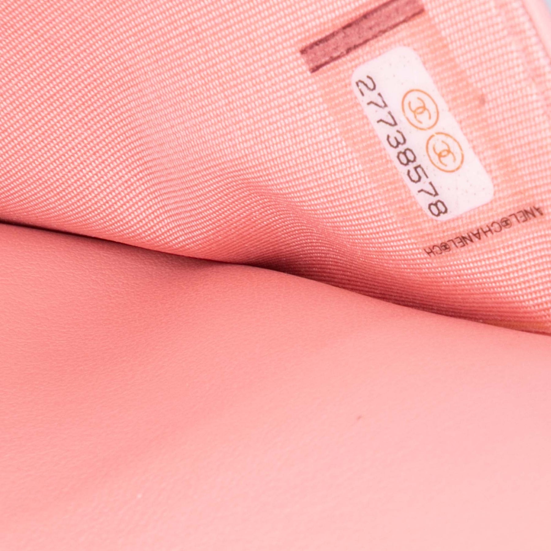Ce portefeuille à chaîne est doté d'un corps en caviar matelassé, d'une bandoulière en chaîne avec protection en cuir, d'un rabat avant avec fermeture à poussoir et de poches intérieures zippées et plaquées. Il est en excellent état.
