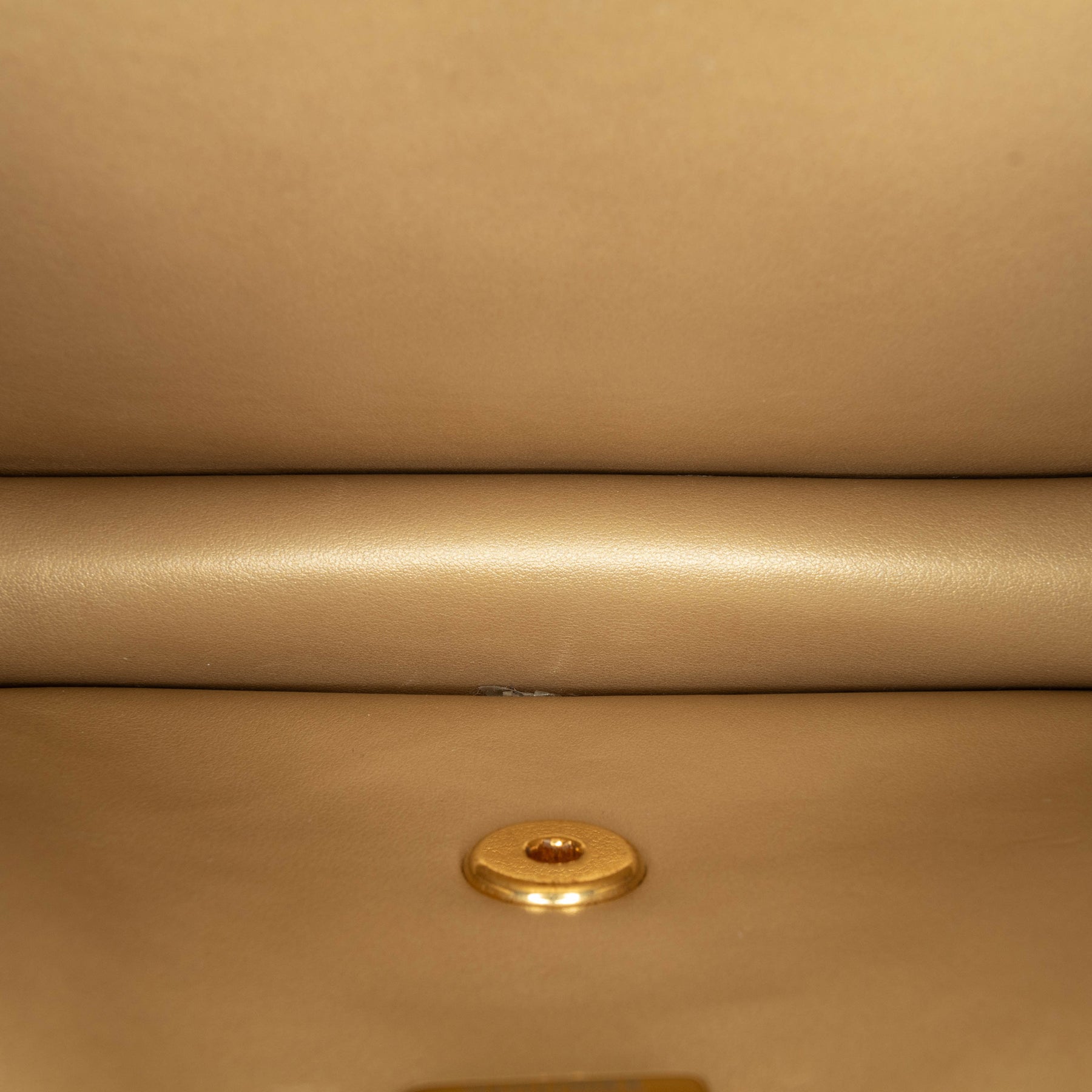 Ce sac bandoulière est en cuir d'agneau, possède une bandoulière en chaîne tressée de cuir, un rabat avant avec fermeture à fermoir et une poche intérieure zippée. Il est en bon état.