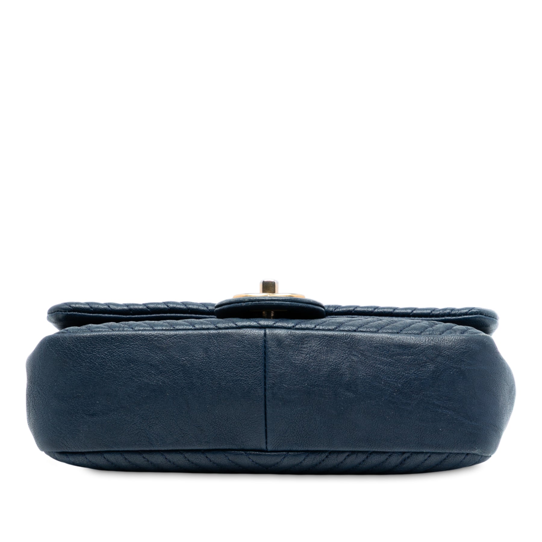 Ce sac bandoulière est confectionné en cuir d'agneau matelassé et possède une bandoulière en chaîne tressée de cuir, un rabat avec fermoir CC et une poche intérieure zippée. Il est en excellent état.