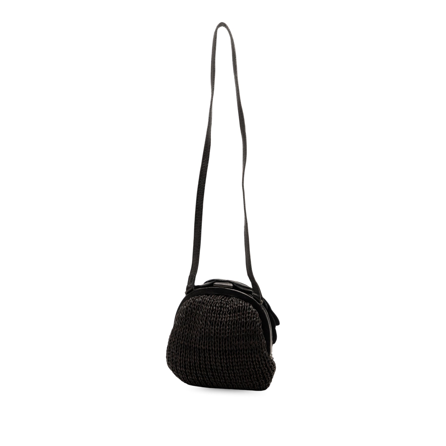 Ce sac bandoulière est en cuir tressé, avec une bandoulière plate en cuir et une fermeture à fermoir. Il est en bon état.