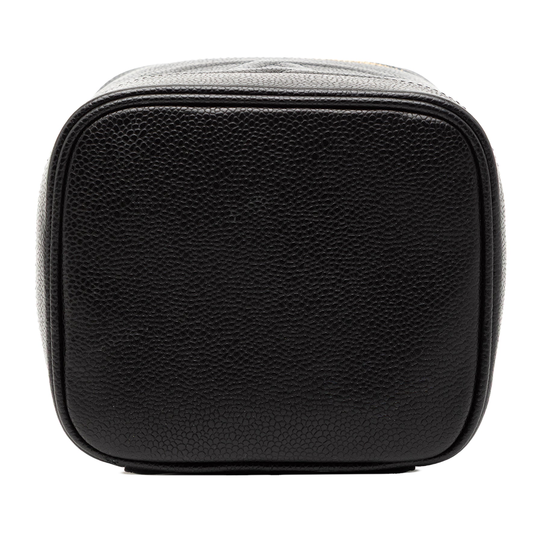 Ce sac vanity est en cuir caviar, possède une poignée plate en cuir, une fermeture zippée et une poche intérieure plaquée. Il est en excellent état.