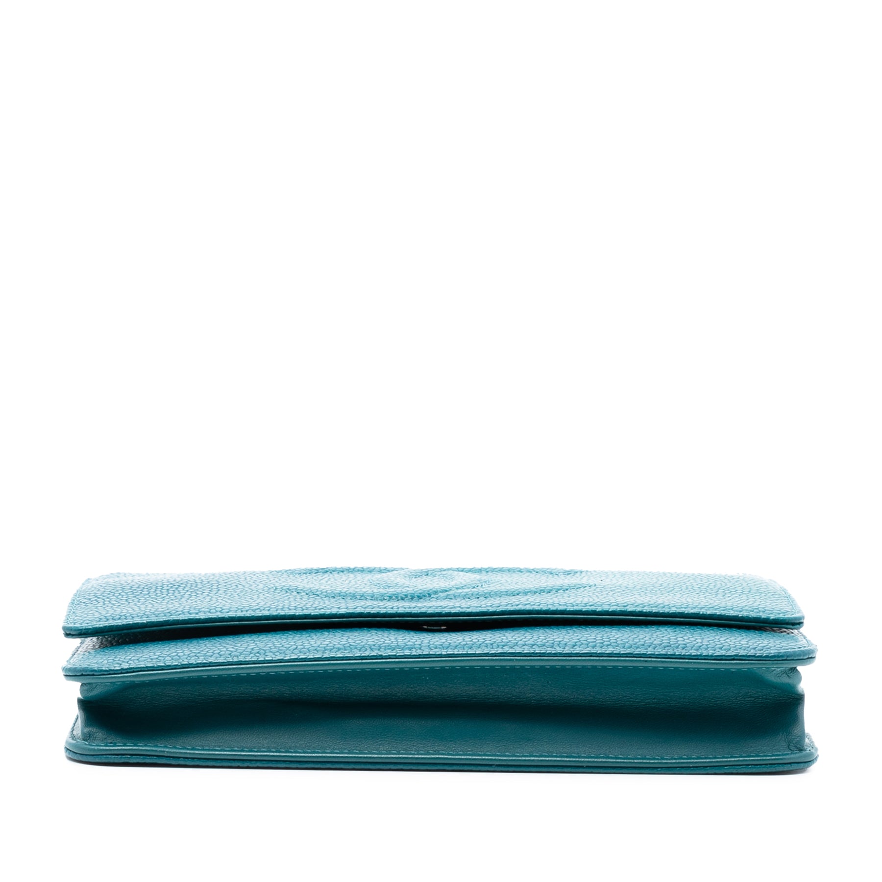 Ce portefeuille à chaîne est confectionné en cuir caviar et possède une bandoulière en chaîne tressée de cuir, un rabat supérieur à fermeture magnétique, ainsi que des poches intérieures zippées et plaquées. Il est en excellent état.