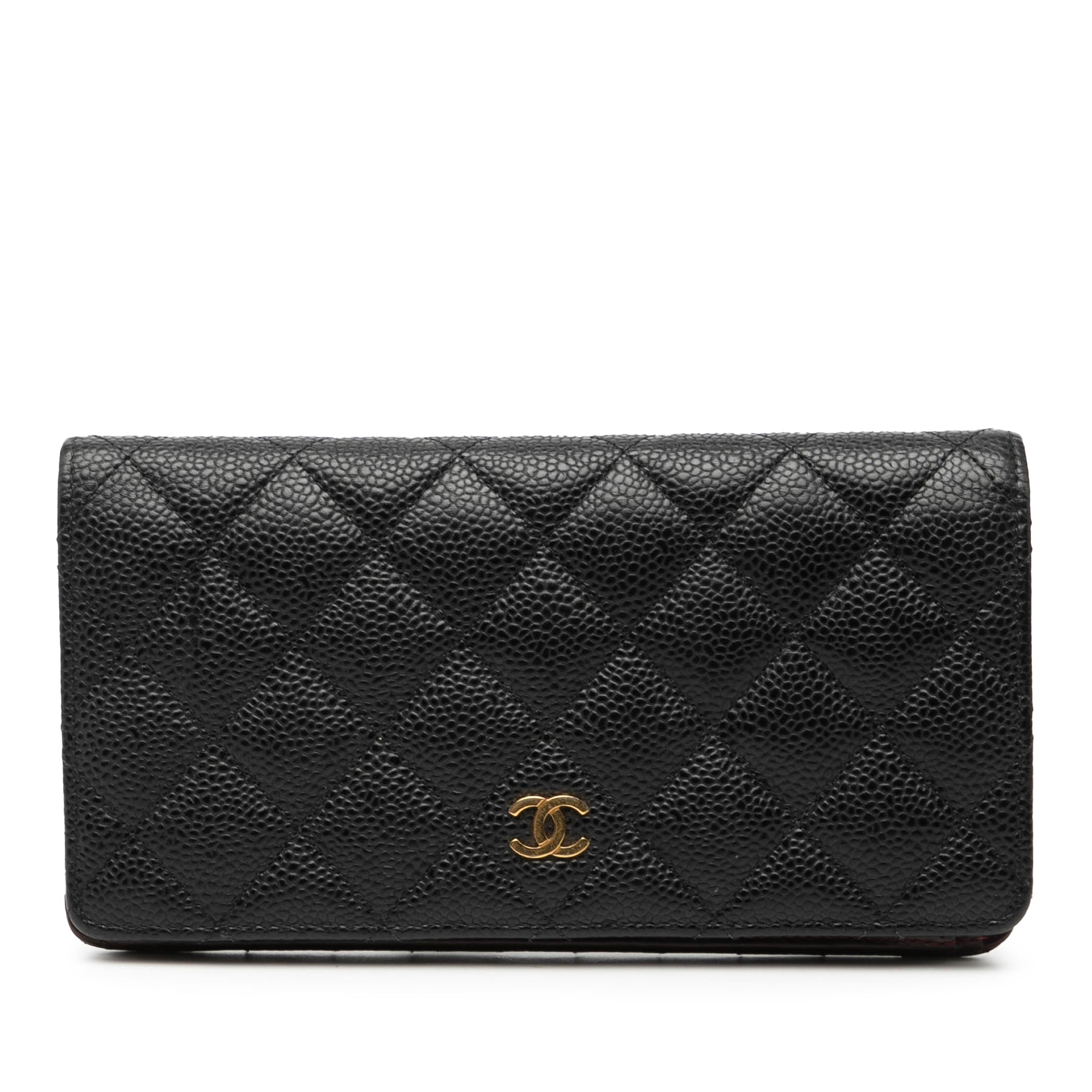 Ce portefeuille est en cuir caviar, possède un rabat avant avec fermeture magnétique, ainsi que des compartiments intérieurs zippés et plaqués. Il est en bon état.
