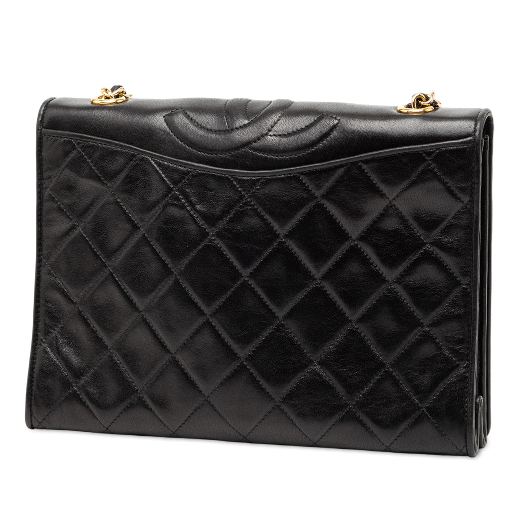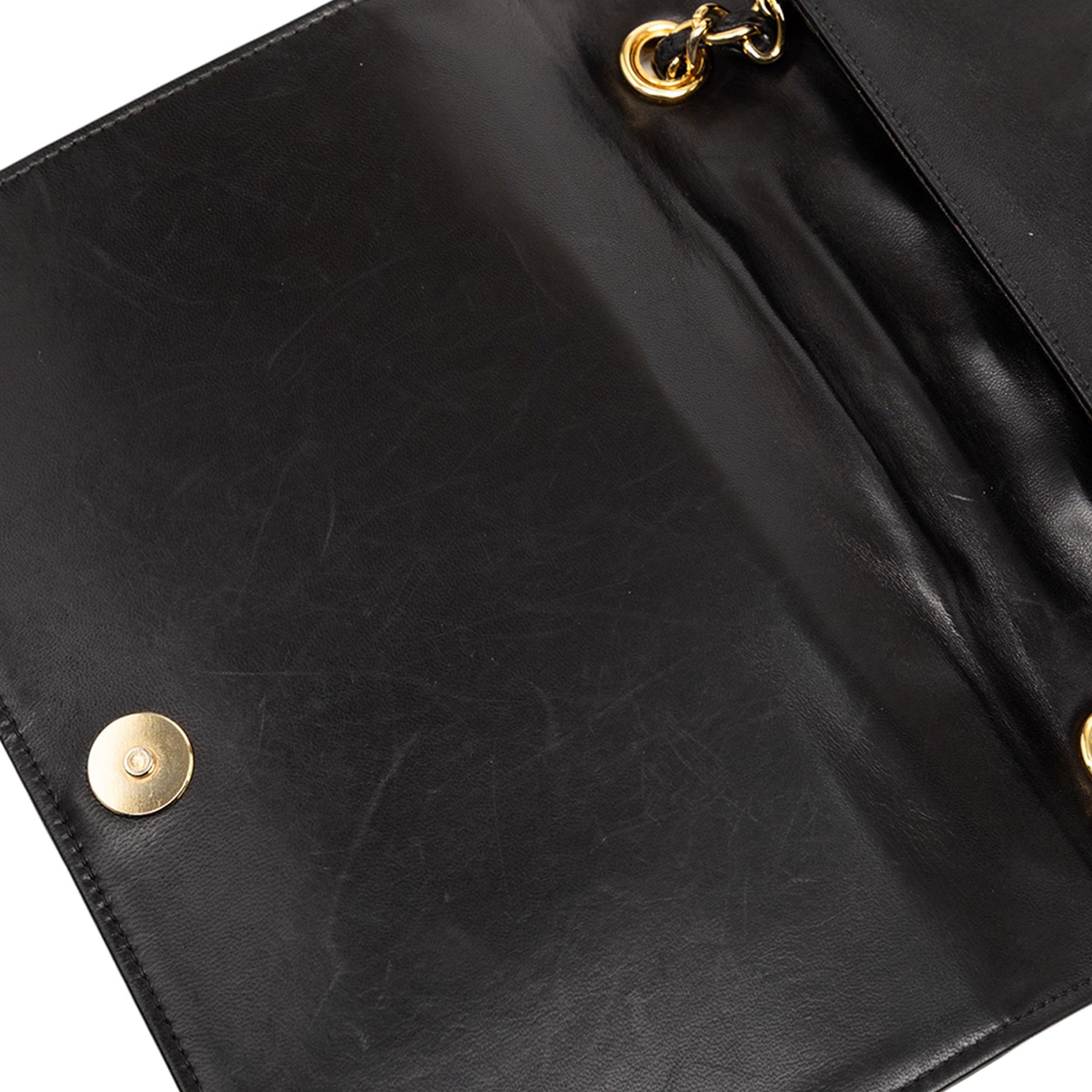 Ce sac bandoulière est confectionné en cuir d'agneau matelassé et possède une bandoulière en chaîne tressée de cuir, un rabat avant à fermeture magnétique et une poche intérieure zippée. Il est en bon état.