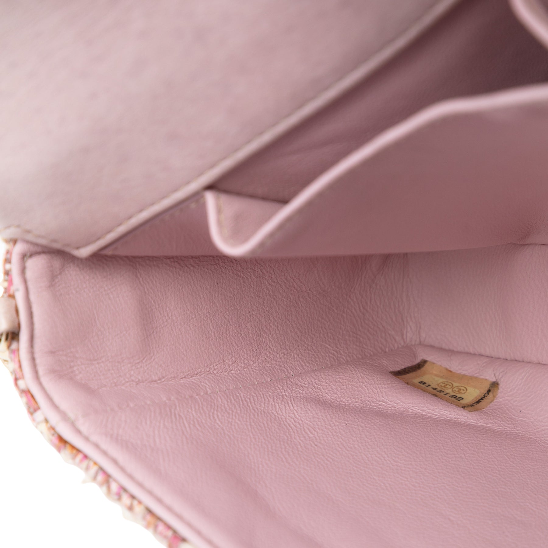 Ce sac bandoulière est en tweed, avec une bandoulière en chaîne tressée de cuir, un rabat à fermoir CC et des poches intérieures plaquées. Il est en bon état.