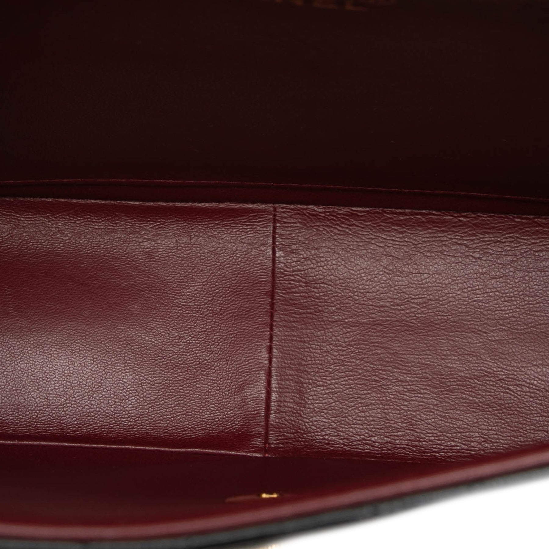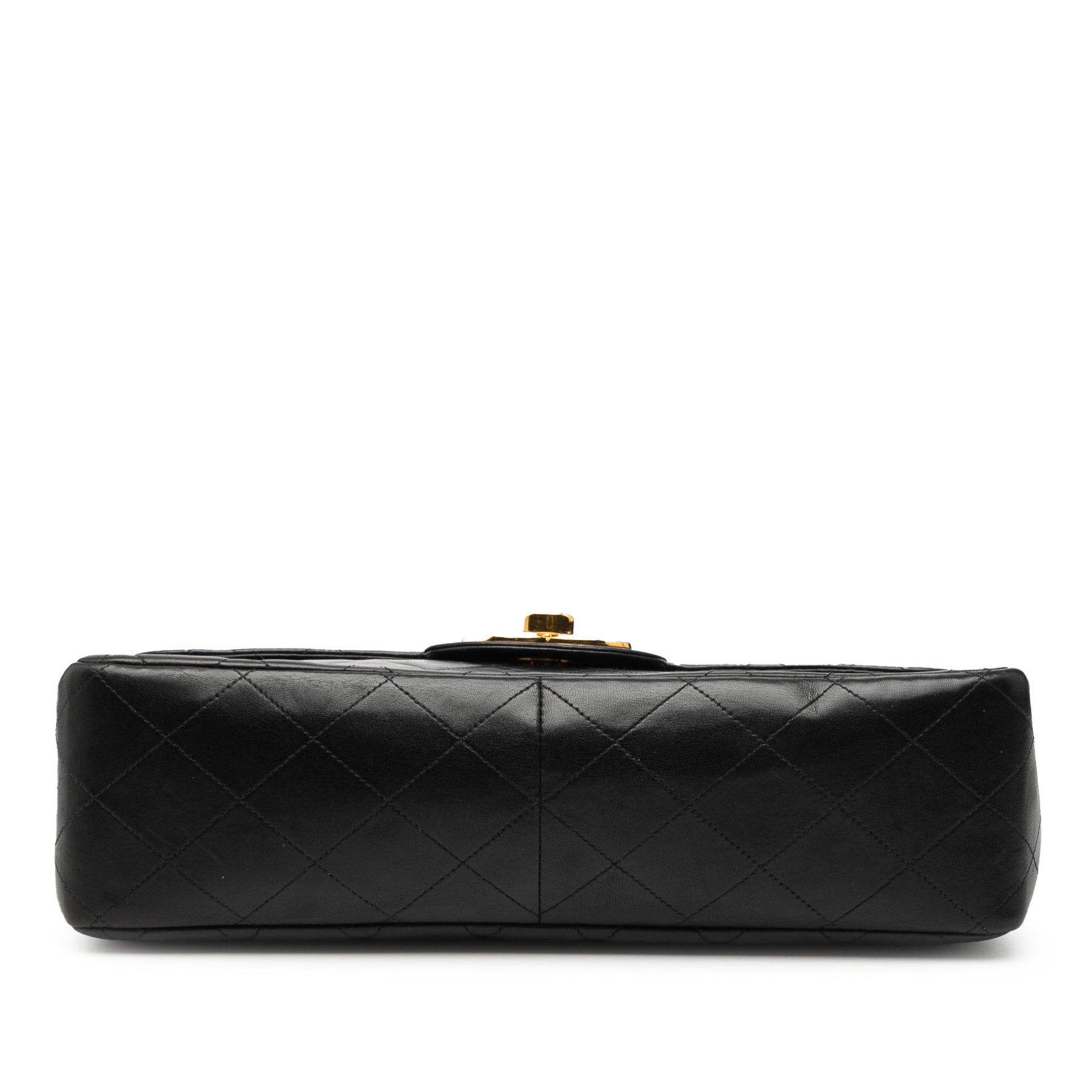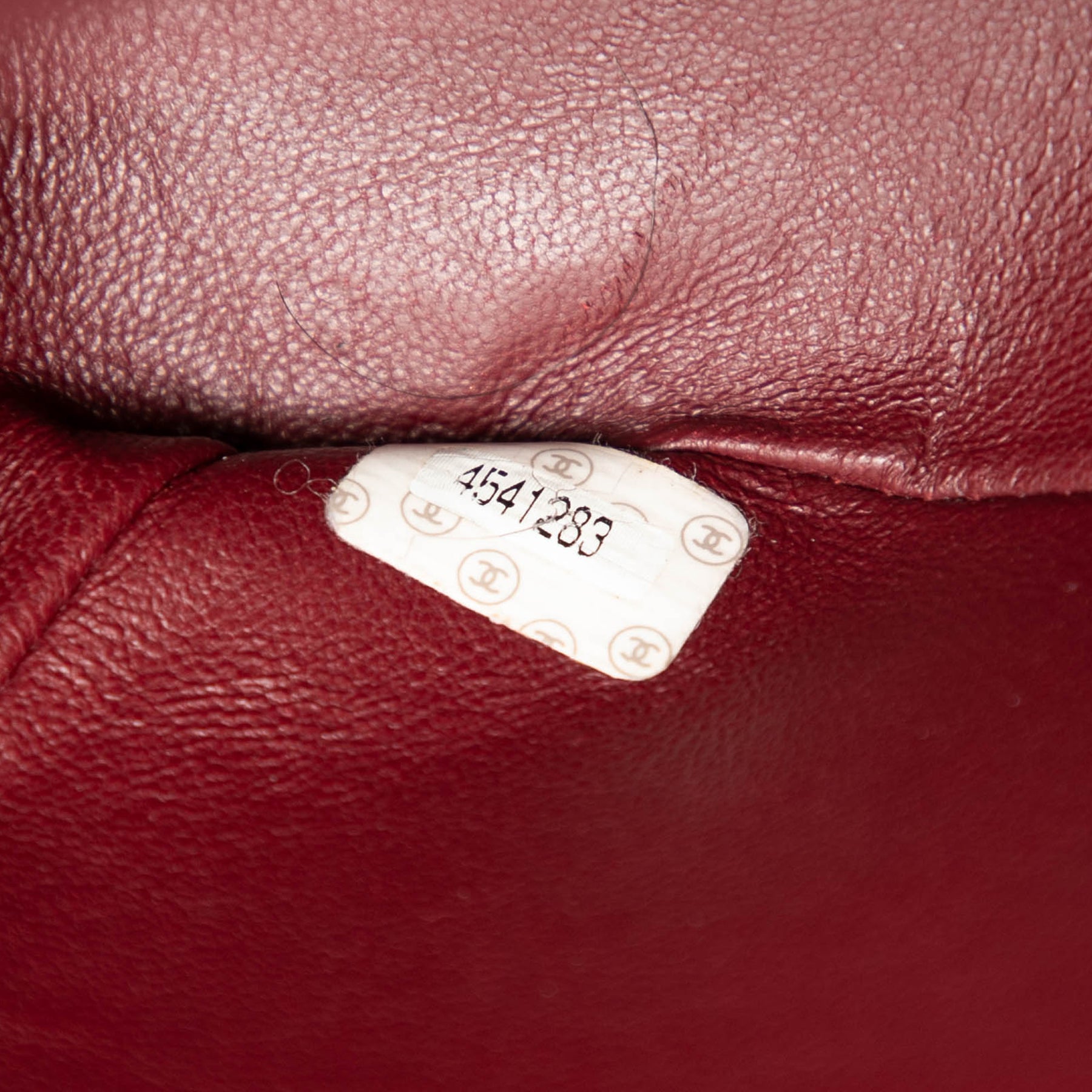 Ce sac à rabat est confectionné en cuir d'agneau matelassé, avec des bandoulières en chaîne de cuir tressé, un rabat avant orné de deux C entrelacés et d'une fermeture à tourniquet, une poche plaquée extérieure au dos, ainsi que des poches intérieures zippées et plaquées. Il est en bon état.