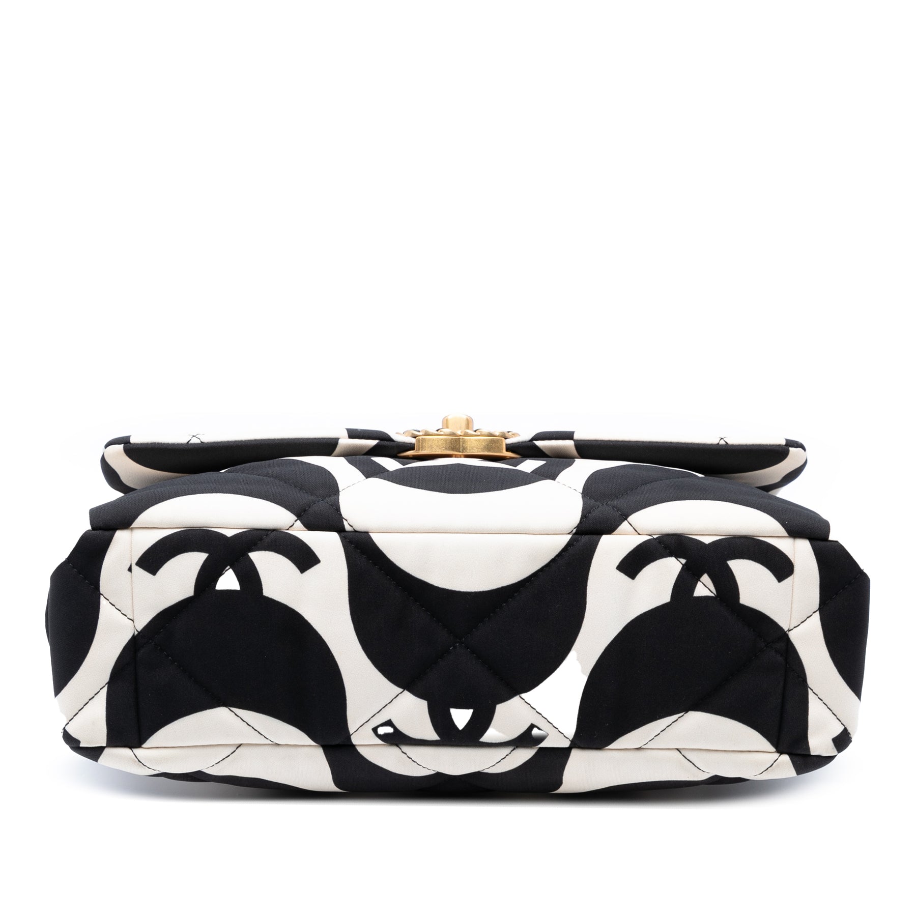 Le sac Large 19 Flap est confectionné en soie matelassée et imprimée, et présente une anse chaîne dorée, une bandoulière chaîne en cuir tressé, un rabat avec fermoir CC, une poche extérieure plaquée et une poche intérieure zippée. Il est en bon état.