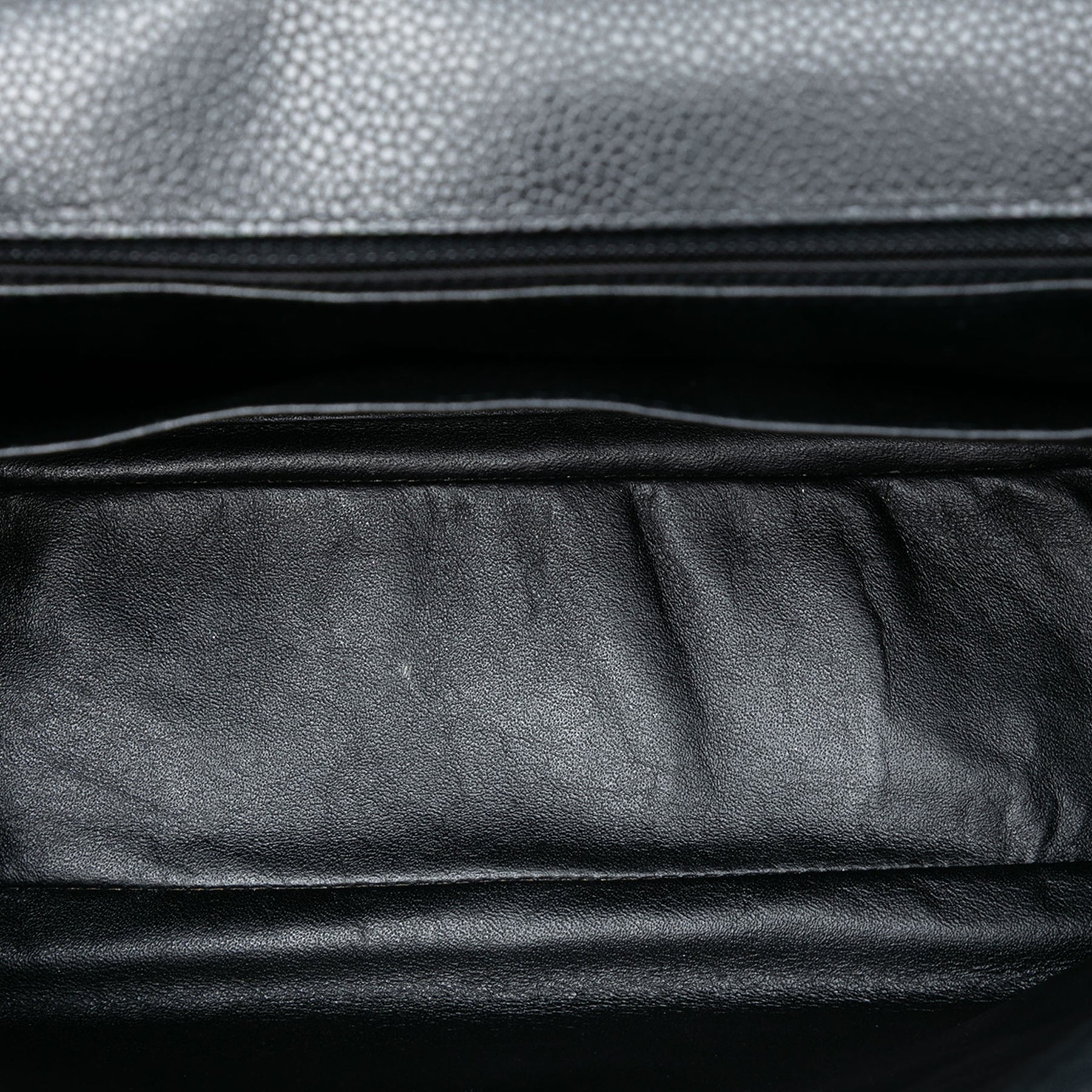 Le sac Classic Flap est confectionné en cuir caviar matelassé et possède des bandoulières en chaîne tressée de cuir, un rabat avant orné du double C et d'une fermeture à tourniquet, une poche plaquée extérieure au dos, ainsi que des poches intérieures zippées et plaquées. Il est en bon état.