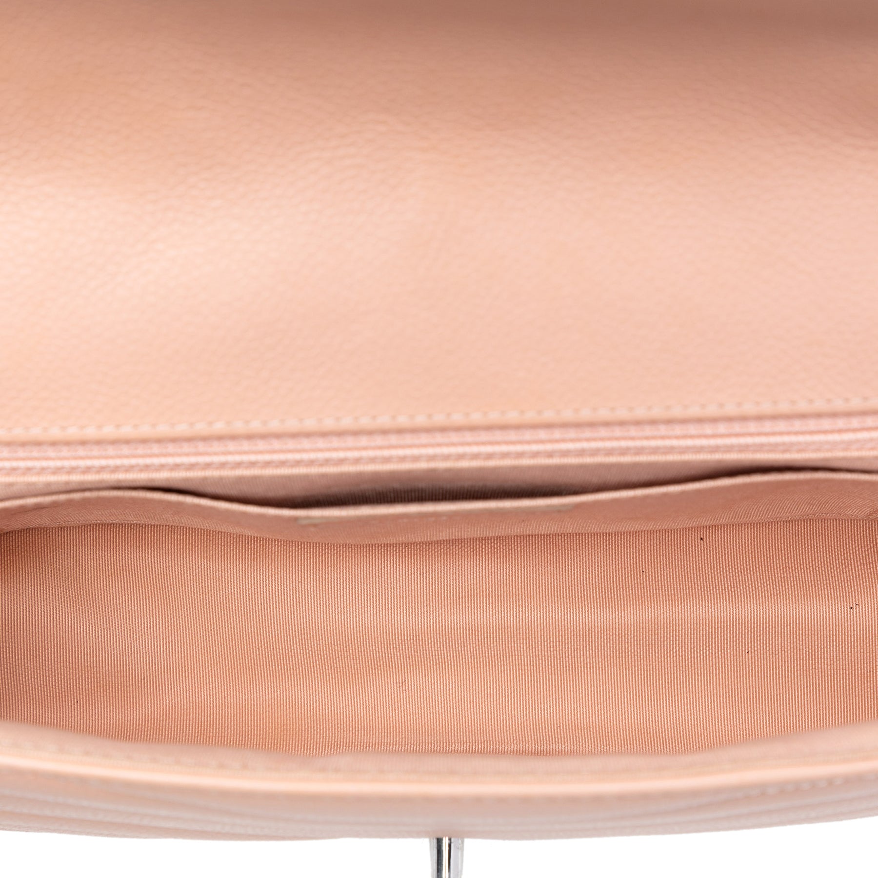 Ce sac bandoulière est confectionné en cuir caviar à chevrons, possède une bandoulière en chaîne et cuir tressé, un rabat style enveloppe avec fermoir CC, une poche extérieure plaquée et des poches intérieures zippées et plaquées. Il est en excellent état.