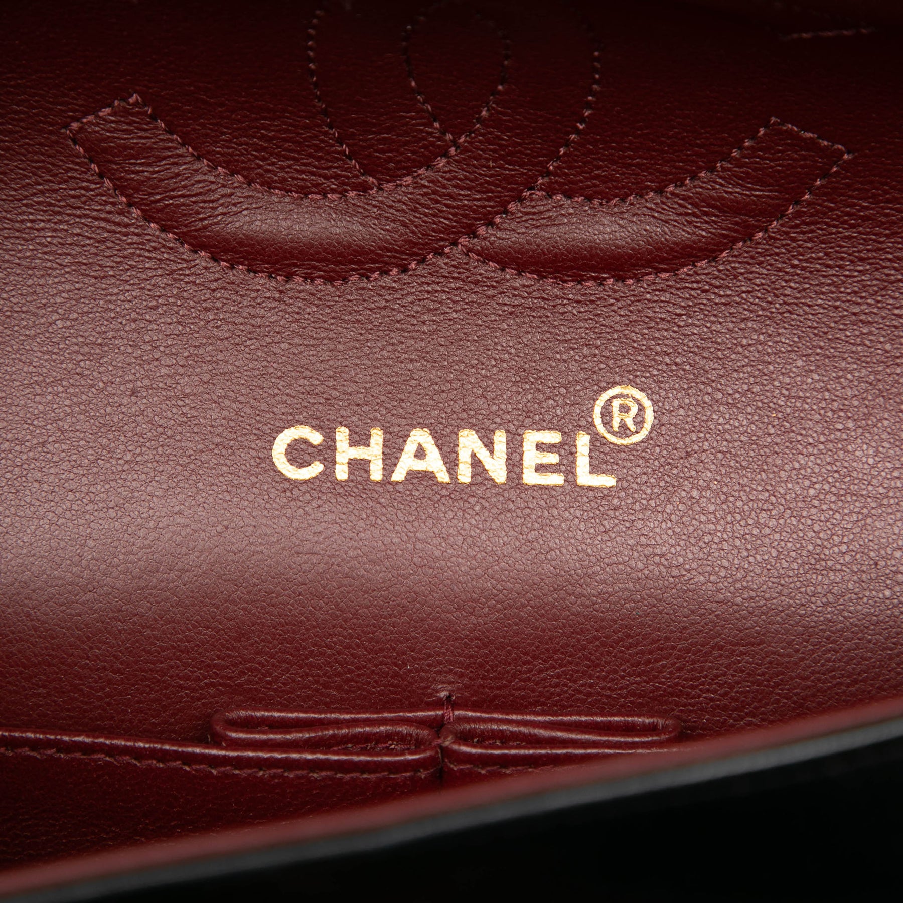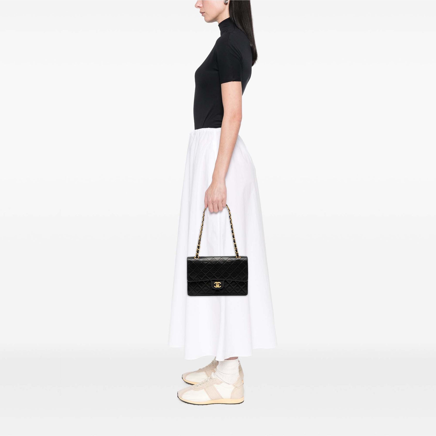 Ce sac bandoulière est confectionné en cuir d'agneau matelassé et présente des bandoulières en chaîne tressée de cuir, un double rabat avant orné du double C entrelacé et d'une fermeture à tourniquet, une poche plaquée extérieure au dos, ainsi que des poches intérieures zippées et plaquées. Il est en bon état.
