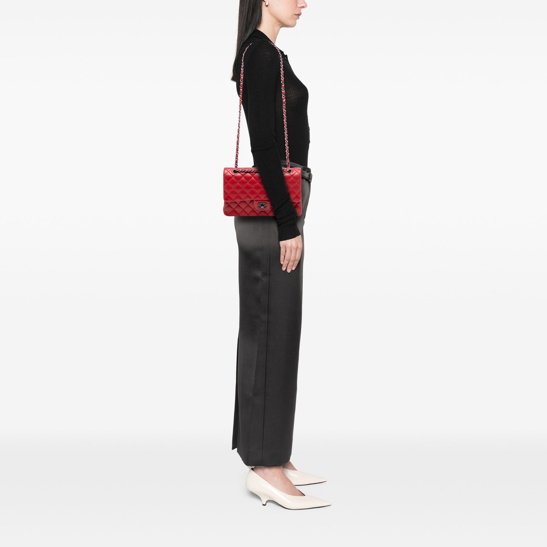 Ce sac bandoulière est confectionné en cuir d'agneau matelassé et présente des bandoulières en chaîne tressée de cuir, un double rabat avant orné du double C entrelacé et d'une fermeture à tourniquet, une poche plaquée extérieure au dos, ainsi que des poches intérieures zippées et plaquées. Il est en excellent état.