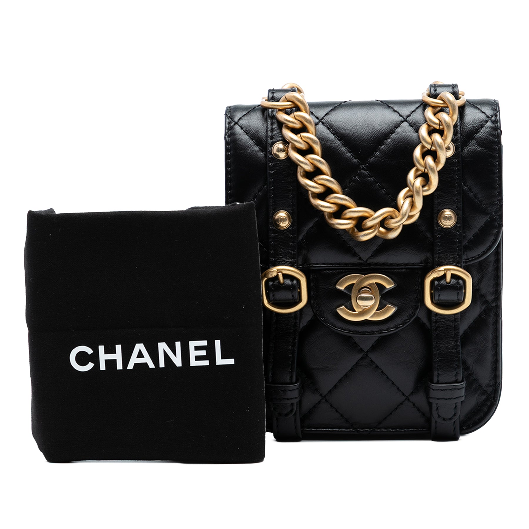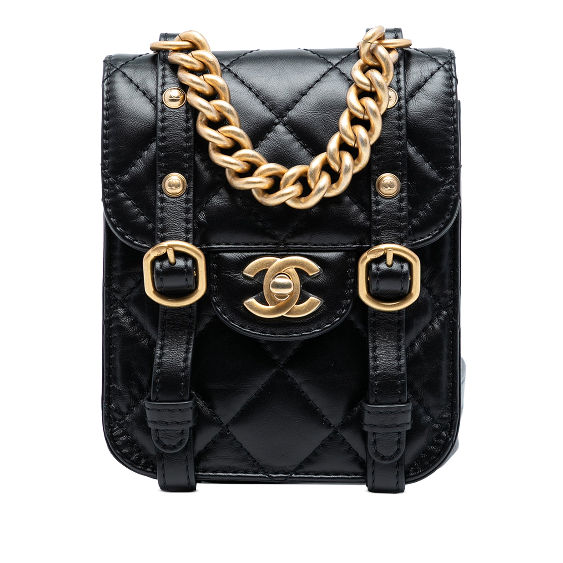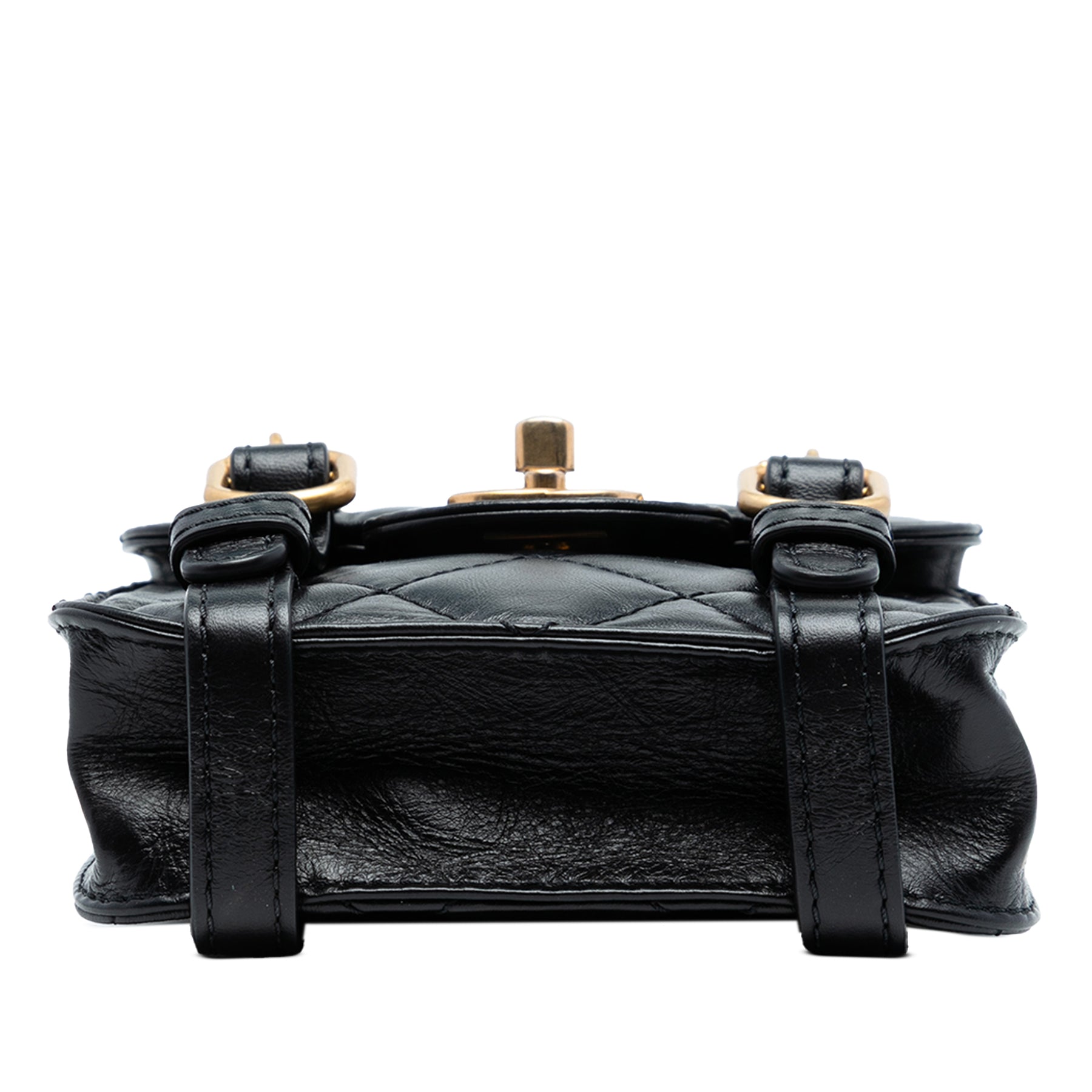 Le sac Mini City School est doté d'un corps en cuir matelassé, d'une poignée en chaîne dorée, d'une bandoulière réglable en cuir et chaîne, et d'un rabat supérieur avec fermoir CC. Il est en excellent état.