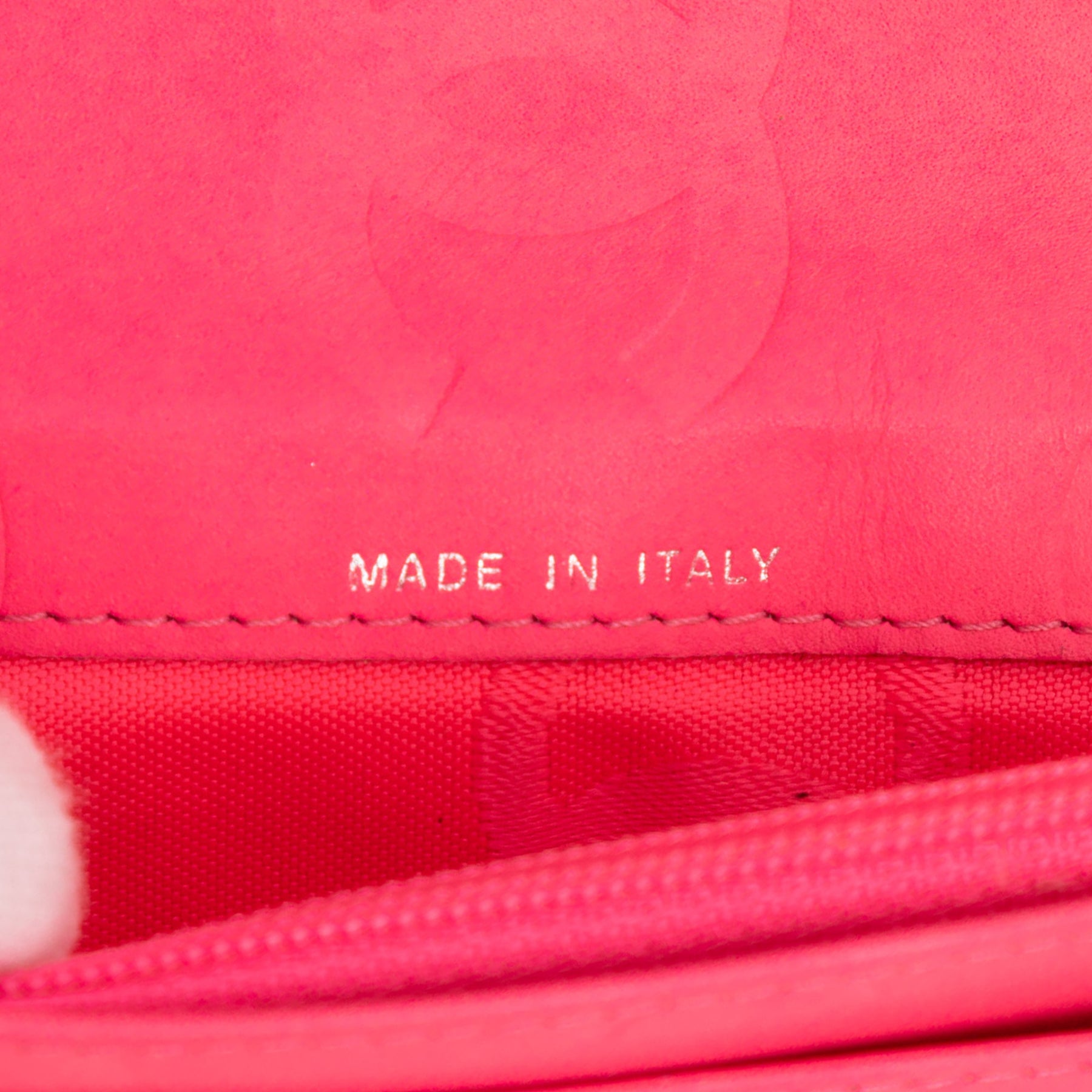 Ce portefeuille est en cuir d'agneau matelassé et possède une poche intérieure zippée ainsi qu'une poche plaquée. Il est en bon état.