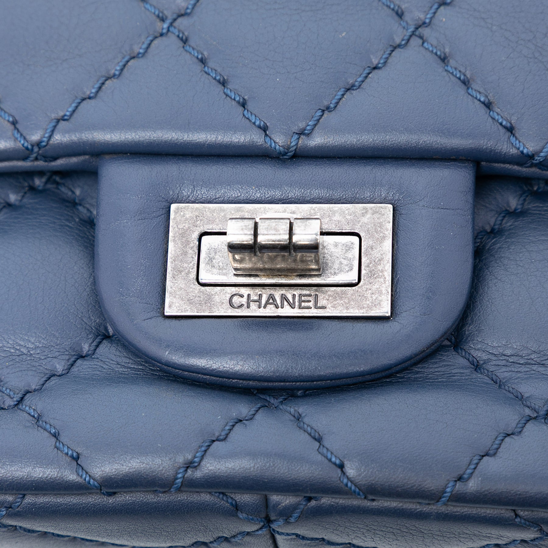 Ce sac bandoulière est confectionné en cuir de veau vieilli matelassé et possède une bandoulière chaîne, un double rabat avant avec fermeture à tourniquet, une poche plaquée extérieure au dos, ainsi que des poches intérieures zippées et plaquées. Il est en excellent état.