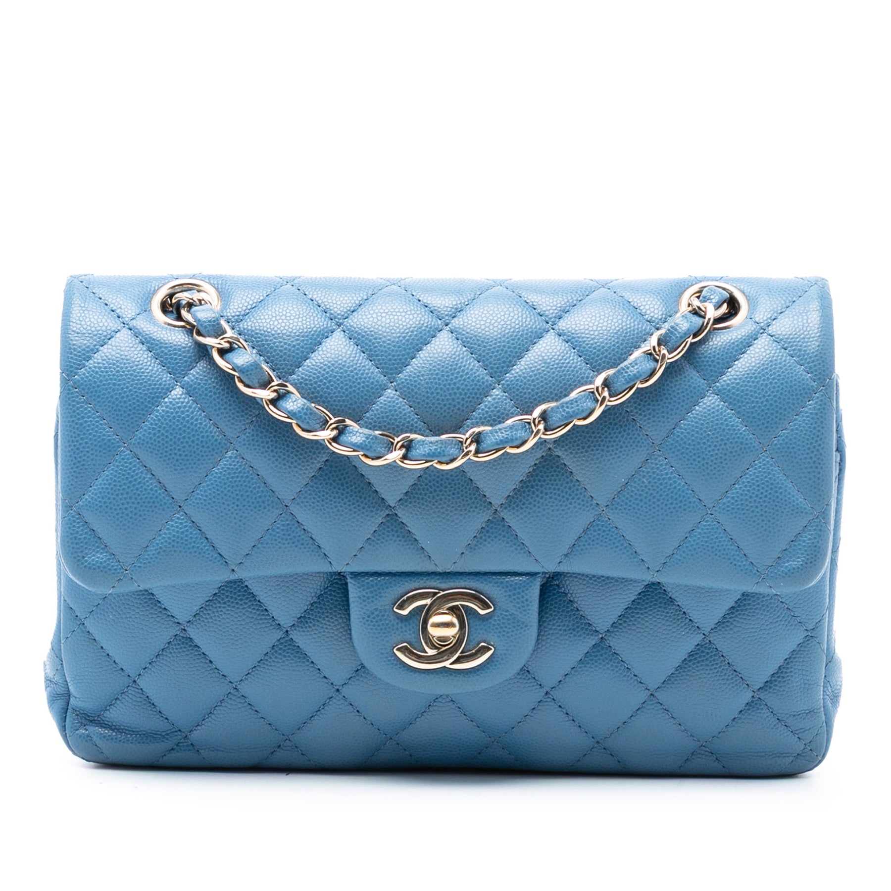 Ce sac bandoulière est confectionné en cuir caviar matelassé et possède des bandoulières en chaîne tressée de cuir, un double rabat avant avec fermoir CC, une poche plaquée extérieure au dos, ainsi que des poches intérieures zippées et plaquées. Il est en bon état.