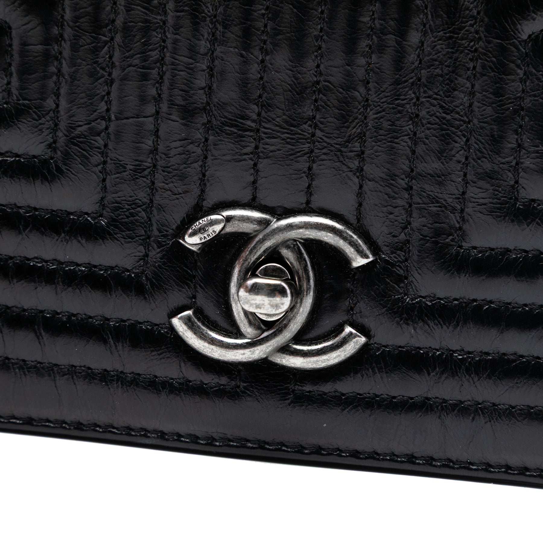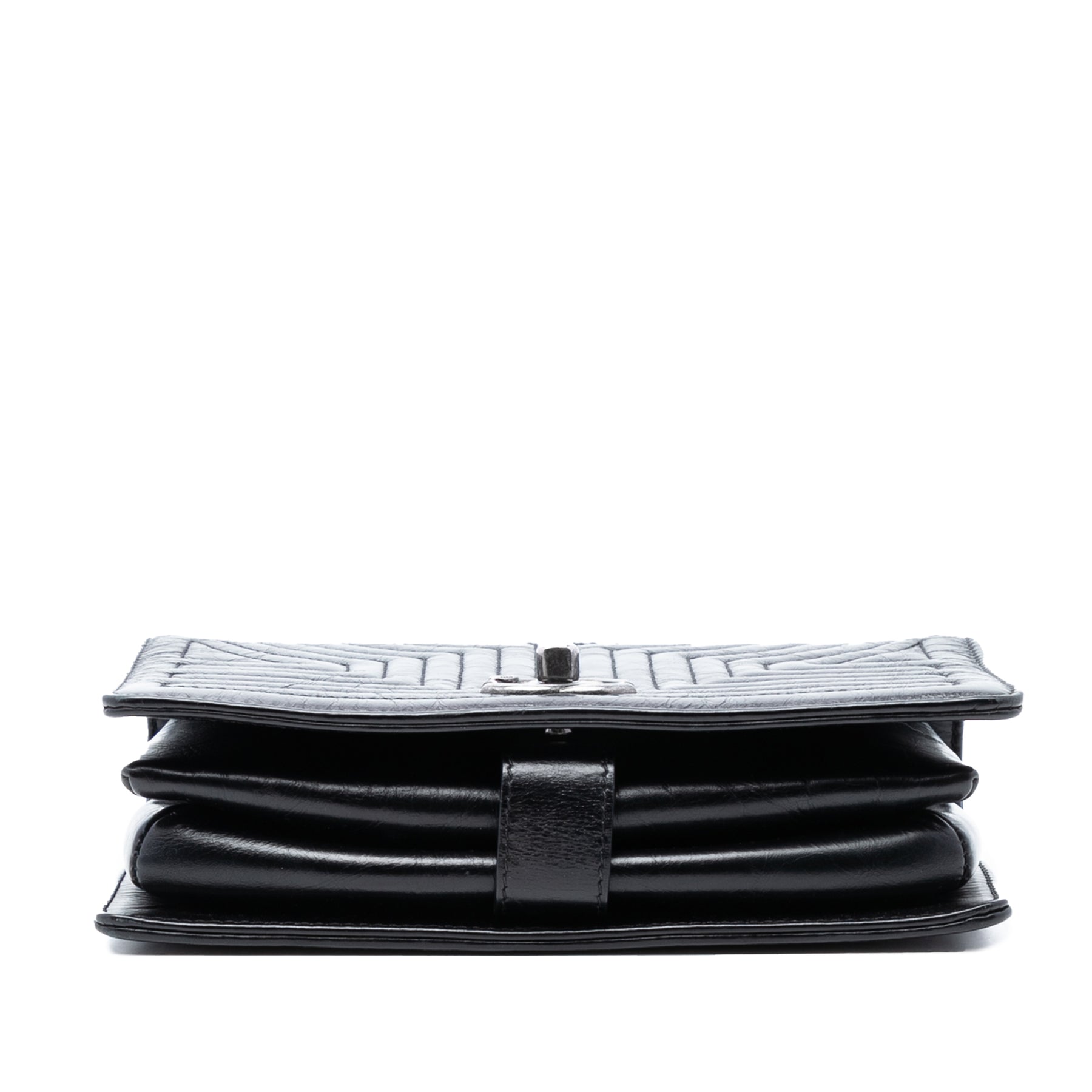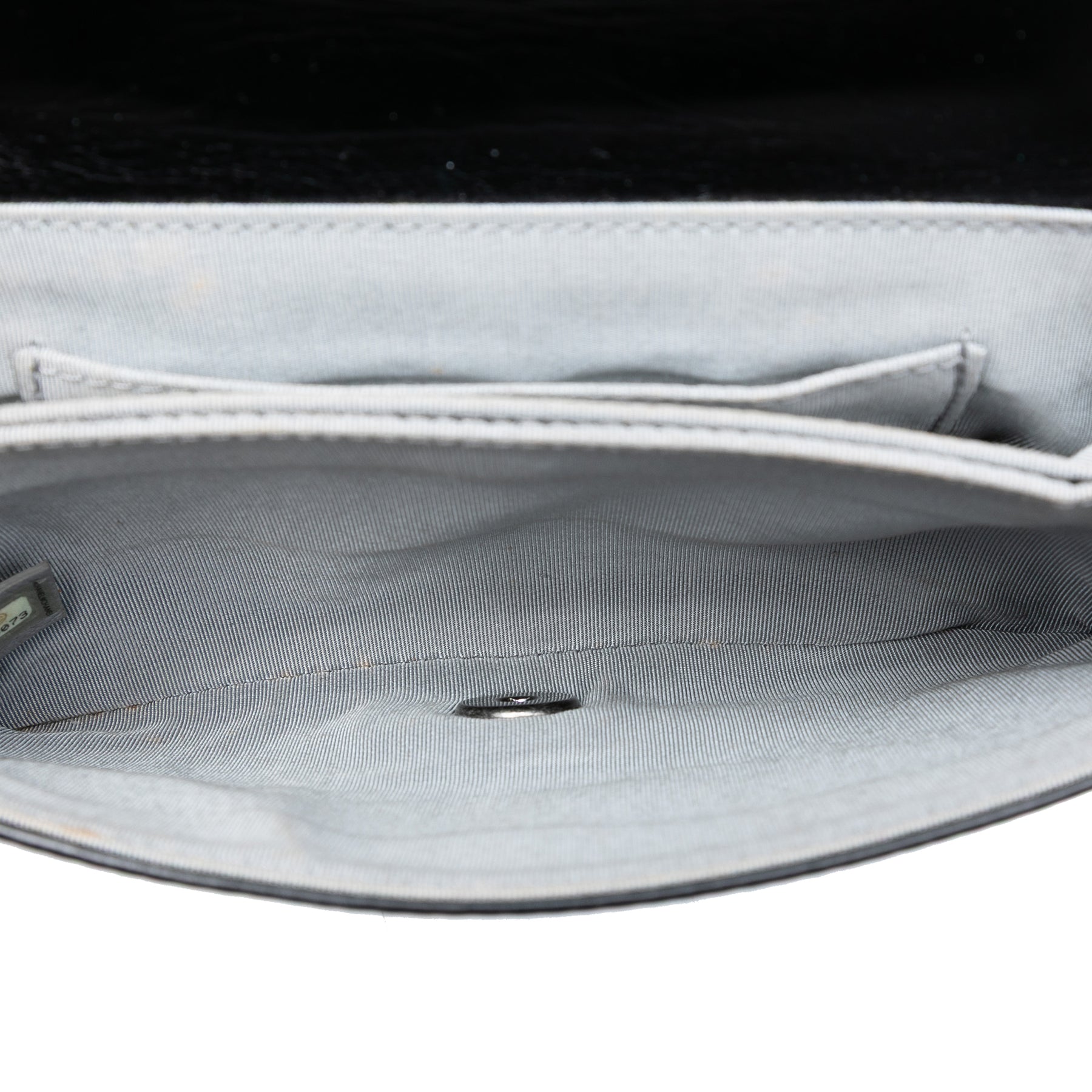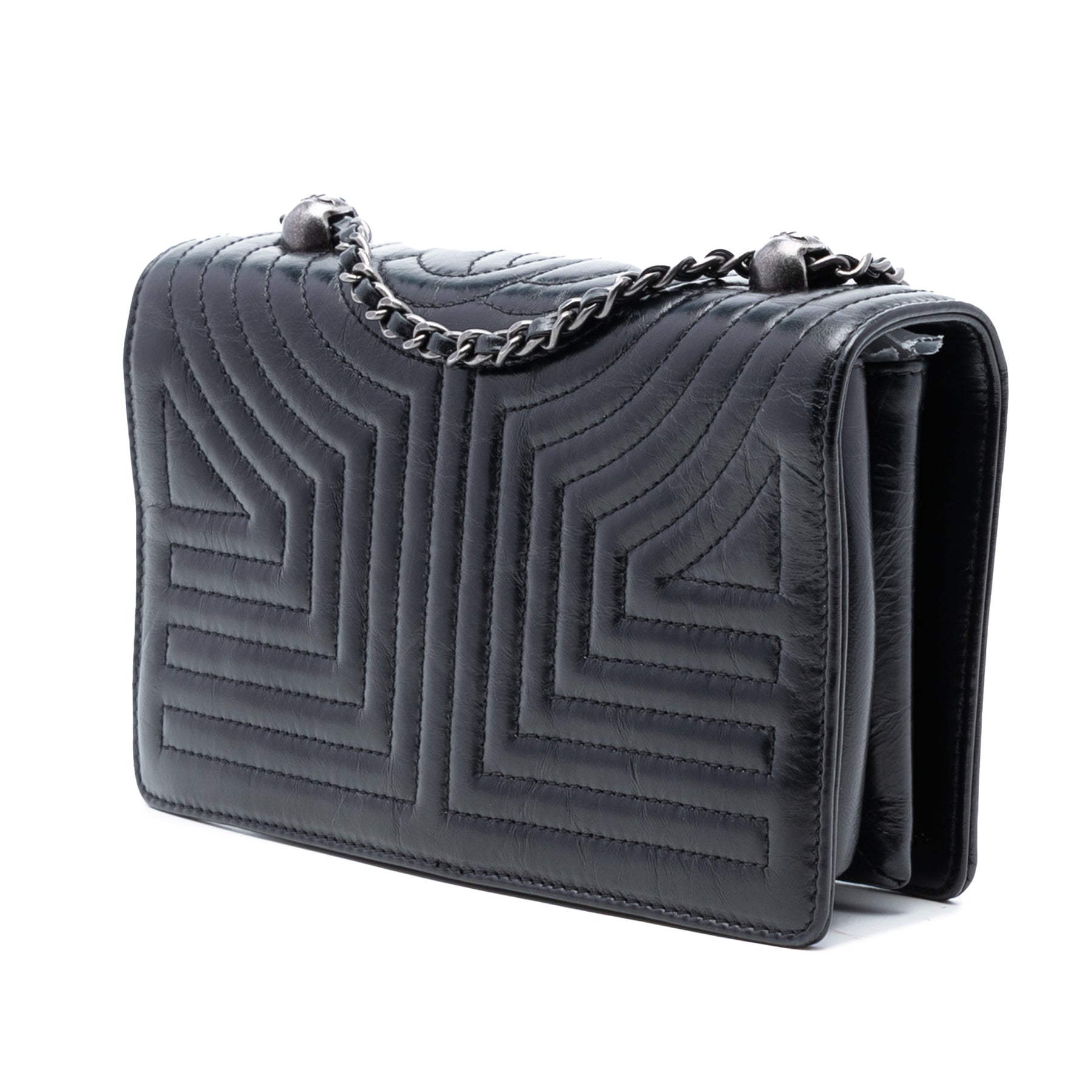 Ce sac à rabat est confectionné en cuir de veau matelassé et possède une bandoulière en chaîne tressée avec protection en cuir, un rabat avant à fermeture tourniquet, ainsi que des poches intérieures zippées et plaquées. Il est en excellent état.