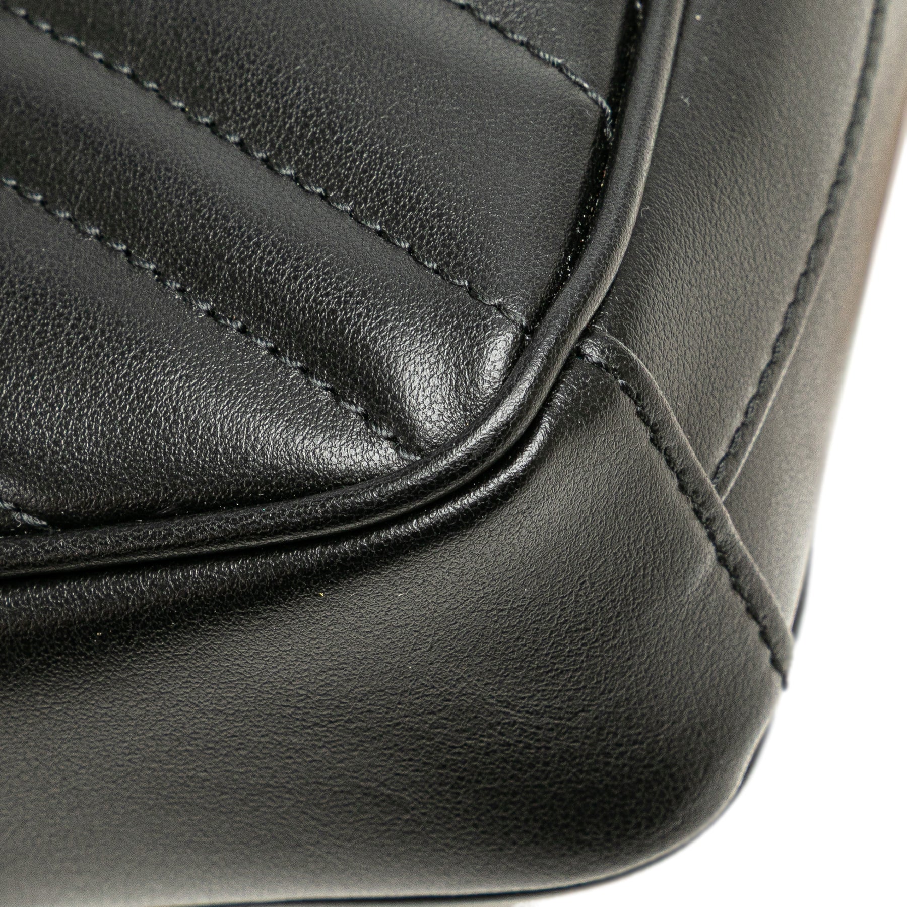 Ce sac bandoulière est en cuir matelassé, possède une bandoulière chaîne à maillons gourmette, une fermeture zippée sur le dessus et des poches intérieures plaquées. Il est en excellent état.